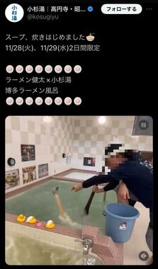 1: 愛の戦士 ★ 2023/11/29(水) 14:34:06.37 ID:+0/DN+UK9 東京・高円寺にある老舗銭湯「小杉湯」が2023年11月28日、「博多ラーメン風呂」と称し、浴槽に豚骨スープを入れてかき混ぜる動画をX(旧ツイッター)に投稿した。これに対し、SNSでは「気持ち悪い」などと批判が相次いでいる。 こうした中、銭湯は翌29日の投稿で、「衛生管理上の注意は十分行なっております」と説明しつつも、同日も予定していた「博多ラーメン風呂」は中止すると発表した。 「まじで豚骨入れてるの…?」 発端となった小杉湯の投稿では、「スープ、炊きはじめました」と宣伝し、「博多ラーメン風呂」と称したイベントを28、29日に実施すると予告した。約20秒の動画では、1人が浴槽のお湯に豚骨スープを入れ、もう1人がかき混ぜる様子が映っていた。 別の投稿では、今回の風呂の詳細を紹介。「白湯豚骨スープの素」を投入するとし、「臭みもキツくなく、お湯としても楽しんでいただける香り」と説明した。 このイベントに対し、SNSでは「公衆浴場としてどうなんだろう?」「まじで豚骨入れてるの…?」「気持ち悪い」などと批判の声が相次いだ。一方、「めちゃくちゃ行きたい」「小杉湯攻めてる」などの声もあった。 こうした中、銭湯は29日までに上記投稿を削除。博多ラーメン風呂を中止すると同日の投稿で発表した。 「衛生管理上の注意は十分行なっておりますが、皆さまに『安心して、きもちよく』お風呂に入って頂くため、本日も予定しておりました博多ラーメン風呂につきましては中止とし、内容を変更致します」 「昨日に引き続きご来店を心待ちにしておられたお客様につきましては、大変申し訳ございません」と謝罪した上で、「昨晩は高濃度塩素での配管清掃、今朝もいつも以上に清潔にこだわり清掃を行いました」と説明。投稿の動画では、浴場を清掃する様子を映した。 続けて、「これからも皆さんに安心して入っていただけるよう、きれいで、清潔で、きもちのいいお風呂を準備してお待ちしております」と述べている。 https://news.livedoor.com/article/detail/25437905/ 正直違いがよくわかってないものってある? 続きを読む Source: 哲学ニュースnwk 投稿ナビゲーション 女子高生が男に「月曜、覚えとけよ」と火曜日に言われる 数分後別の場所でも同じ言葉をかけられる 半分赤で半分青、2つの色で2つの性別を持つ雌雄モザイクのロブスターが捕獲される。5000万匹に1匹のレア度