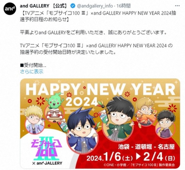 1: 愛の戦士 ★ 2023/12/07(木) 12:16:40.70 ID:+qi3XL8p9 and GALLERY公式X(@andgallery_info)から さまざまな人気アニメとのコラボカフェギャラリーを開催している「and GALLERY」の公式SNSが7日に更新され、人気TVアニメ「モブサイコ100 Ⅲ」とのコラボレーションについて言及した。 「モブサイコ100」は、「ワンパンマン」で知られる漫画家・ONEによる同名漫画を原作とするテレビアニメ。2016年に1期が放送され、昨年10月に3期放送がスタートしていた。 同作は6日、and GALLERYとの「HAPPY NEW YEAR 2024」イベントの抽選予約の受付開始を発表。正月らしいイラストが添えられていた。 このイラストに、一部から「旭日旗が描かれている」「謝罪を求めます」などという声が上がった。 この声を受け、「and GALLERY」は「『TVアニメ「モブサイコ 100 II]Xand GALLERY HAPPY NEW YEAR2024』のビジュアルデザインについて」と題するお知らせを更新。「平素よりand GALLERYをご利用頂き、誠にありがとうございます。この度、2024年1月6日より開催予定の『TVアニメ「モブサイ100IIIJXandGALLERY HAPPY NEWYEAR2024』のビジュアル内のデザインについて、一部のSNSメディアでご指摘やご意見を頂いておりますが、弊店としては、お正月をモチーフにしたデザインとして作成したもので、それ以外の意図や意味はございません」と説明した。「お正月の企画として、ファンの皆様に楽しんで頂けるよう、運営していく所存ですので、引き続き開催をお待ち頂ければと思います。今後とも and GALLERYを宜しくお願いいたします」と呼びかけた。 同イベントは来年1月6日から2月4日まで、池袋、道頓堀、名古屋の3店舗で期間限定で開催される。 https://news.livedoor.com/article/detail/25486223/ 音大生「YOSHIKIレベルなら普通にいるけど」俺「すげー!じゃあ今すぐ作曲して売り込んでデビューしたほうがいいね」音大生「・・・」 続きを読む Source: 哲学ニュースnwk 投稿ナビゲーション アレな生態系日常漫画「いぶかればいぶかろう」第40回:猫もいいけど犬もいい。飼い犬との思い出 東京ディズニーランドのパレード、ミニーマウスがトナカイキャラにスカートめくりされる動画拡散で批判殺到「性加害を肯定している」