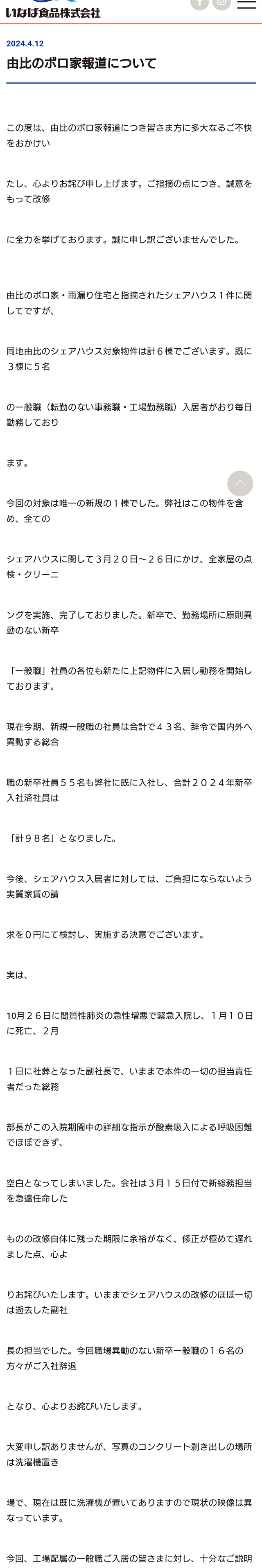1: 警備員[Lv.6][苗](庭) [US] 2024/04/13(土) 05:46:29.23 ID:T/UdPhM80● BE:886559449-PLT(22000) 由比のボロ家報道について この度は、由比のボロ家報道につき皆さま方に多大なるご不快をおかけい たし、心よりお詫び申し上げます。ご指摘の点につき、誠意をもって改修 に全力を挙げております。誠に申し訳ございませんでした。 由比のボロ家・雨漏り住宅と指摘されたシェアハウス1件に関してですが、 同地由比のシェアハウス対象物件は計6棟でございます。既に3棟に5名 の一般職(転勤のない事務職・工場勤務職)入居者がおり毎日勤務しており ます。 今回の対象は唯一の新規の1棟でした。弊社はこの物件を含め、全ての シェアハウスに関して3月20日~26日にかけ、全家屋の点検・クリーニ ングを実施、完了しておりました。新卒で、勤務場所に原則異動のない新卒 「一般職」社員の各位も新たに上記物件に入居し勤務を開始しております。 現在今期、新規一般職の社員は合計で43名、辞令で国内外へ異動する総合 職の新卒社員55名も弊社に既に入社し、合計2024年新卒入社済社員は 「計98名」となりました。 今後、シェアハウス入居者に対しては、ご負担にならないよう実質家賃の請 求を0円にて検討し、実施する決意でございます。 実は、 10月26日に間質性肺炎の急性増悪で緊急入院し、1月10日に死亡、2月 1日に社葬となった副社長で、いままで本件の一切の担当責任者だった総務 部長がこの入院期間中の詳細な指示が酸素吸入による呼吸困難でほぼできず、 空白となってしまいました。会社は3月15日付で新総務担当を急遽任命した ものの改修自体に残った期限に余裕がなく、修正が極めて遅れました点、心よ りお詫びいたします。いままでシェアハウスの改修のほぼ一切は逝去した副社 長の担当でした。今回職場異動のない新卒一般職の16名の方々がご入社辞退 となり、心よりお詫びいたします。 大変申し訳ありませんが、写真のコンクリート剥き出しの場所は洗濯機置き 場で、現在は既に洗濯機が置いてありますので現状の映像は異なっています。 全文 https://www.inaba-foods.jp/topics/detail/1068 これはアカン!!という画像貼っていけ 続きを読む Source: 哲学ニュースnwk 投稿ナビゲーション 【朗報】青森のマグロ丼、ガチ 災害時に絶対に持っていたほうがいいもの