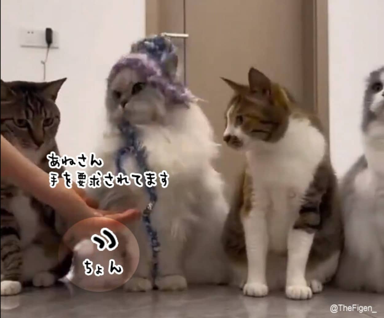 4匹の猫たちが一列に並んでさながらアイドルの握手会場のようだ。特にひとりだけゴージャスな帽子を身に着けた左から2番目の猫にどうしても注目が集まる。人間のアイドル的に言えばセンター的存在なのかもしれない。 画面右側の猫から順番に人間に手を差し出すわけだが、この子はおすましをしていて手を差し出す様子は全くない。 そこで隣にいる猫が、「姉さんの番ですよ、握手要求されてまっせ」とそっと下の方で姉さんの前脚をちょんと触り、握手を促したのだ。 続きを読む Source: カラパイア 投稿ナビゲーション 【岡山】「万引きGメン」が勤務中に万引き 63歳男に懲役1年の実刑判決…「保安員でありながら悪質」 小学生男子が将来なりたいもの1位「会社員」