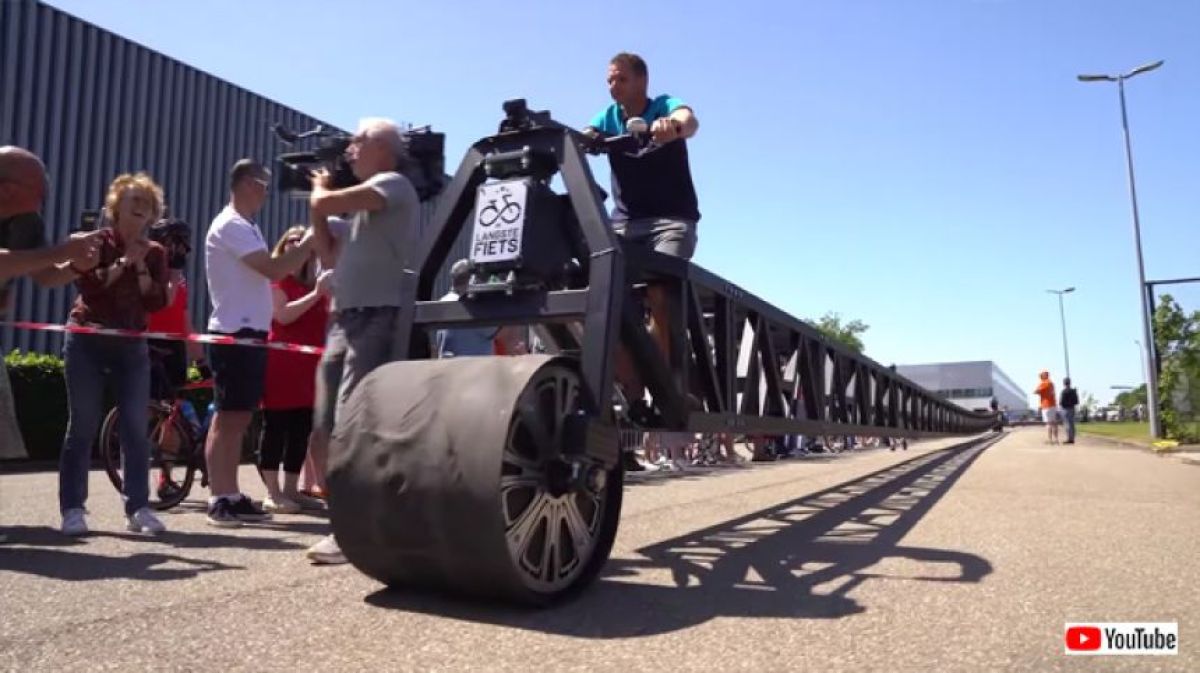電車2両分よりまだまだ長い全長55m。世界一長い自転車はナチュラルに画角をはみ出す長さである。見ためなんだか鉄橋っぽいが、ちゃんと漕げるし進むというから驚きだ。 今回ギネス記録を更新したのは、オランダのチームが作った全長55.16mのスーパーロングな自転車だ。 世界一長い自転車は、チームを率いたシャルクさんの幼少期からの夢だった。その夢が2年の製作期間を経て、やっと現実のものになったという。 References: 180-foot bike certified as world's longest – and it's actually rideable / World’s Longest Rideable Bicycle Is Over 55 Meters Long 続きを読む… ▼あわせて読みたい ・その数何と200両以上!アメリカの穀物貨物列車が長すぎて終わりが見えない ・世界最長の車は全長約31メートル!プールからヘリポートまでついている ・無茶しやがって…72メートルの構造物を輸送し、高速道路を走るアメリカのトラック ・逆マンチカン?超長足な猫の個体が確認され話題に ・なるほどこれはわかりやすい。60秒でわかる自転車、進化の歴史 この記事のカテゴリ:グッズ・商品 / サブカル・アート Source: カラパイア 投稿ナビゲーション 20代巡査が無断欠勤で東京ディズニーランドへ 兵庫県警が処分 借金400万円「お金の指導が嫌になった」「無断欠勤をすれば辞められる」 名古屋市、1600億円減税(市民税10%減)したら3000億円税収が増えていた 「減税すると税収増」説