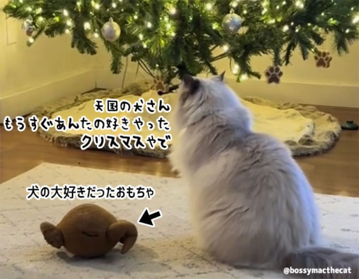 かつてこの家にはボンバーとローパーと言う名の2匹の大型犬とパウセラという名の猫がいた。だがその3匹は1匹ずつ天国へと旅立っていき、最後に残されたのは猫のボッシー1匹となった。 ボッシーと3匹はずっと一緒に育ち、とても仲が良かった。特に犬のボンバーが亡くなったとき、ボッシーはとても落ち込んでいた様子だったという。 そして迎えた今年のクリスマス。飼い主は犬のおもちゃをほとんど片づけていたのだが、ボッシーがボンバーのお気に入りだった七面鳥のおもちゃを探し出し、それをクリスマスツリーの前に置いて、じっとツリーを眺めていたという。 犬と一緒に楽しく過ごしていた時のことを思い出しているかのようにも見え、飼い主は思わず涙した。 続きを読む… ▼あわせて読みたい ・悲しみは人間のものだけなのか?動物たちは死をどのようにとらえているのか? ・猫だって悲しい。共に暮らしていた仲間の犬や猫が死ぬと、悲しみの行動をとることが明らかに ・今は亡き大好きなお父さんの財布を見つけた猫、抱きかかえて寄り添う姿にグッとくる ・仲間の猫が交通事故に。その亡骸を入れた箱の前で悲しみの鳴き声を上げる猫 ・大親友だった犬の亡き後、悲しみに暮れていた猫。 親友の残した首輪を発見し、ニオイを嗅ぎスリスリと頭をこすりつける この記事のカテゴリ:動物・鳥類 / 動画 Source: カラパイア 投稿ナビゲーション 「殺さないで」クマ殺処分の秋田市などに抗議の電話殺到 獣医師立ち合いで麻酔後に電気殺 石破、髪の毛が突然増える