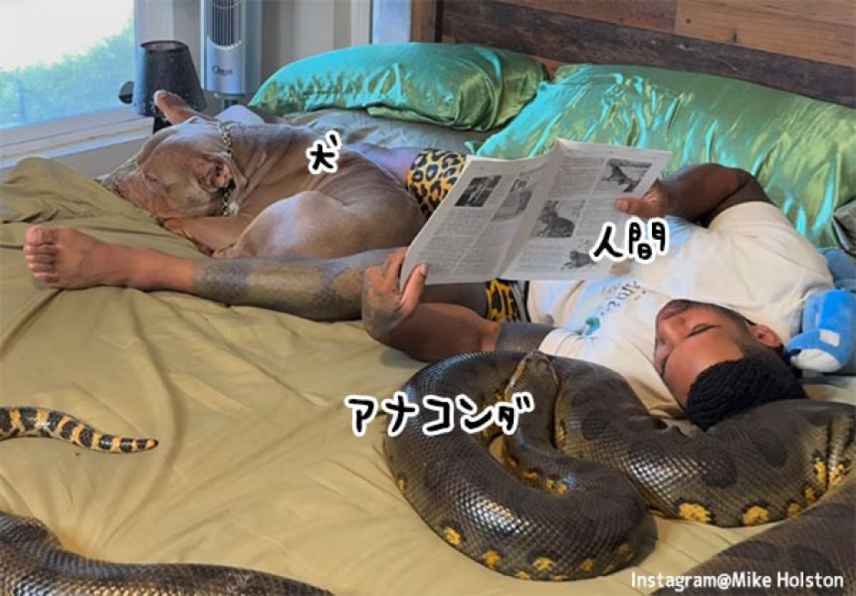Instagram@Mike Holston 部屋とワイシャツと私とかではない。「犬とアナコンダと私」の世界が実際に存在したのだ。ベッドの上でくつろいでいるのは他ならぬ、人間男性と犬、そして巨大なヘビ、アナコンダである。 男性はイグアナの本をアナコンダと一緒に見ている。ていうか情報量が多すぎて脳が収拾つかなくなるぞ。 続きを読む… ▼あわせて読みたい ・アマゾンで世界最大級のヘビ「アナコンダ」の新種が発見される ・排水溝の中にはアナコンダがぎゅうぎゅうに詰まっていた!(蛇出演中) ・川底でトルネード旋風を巻き起こす!全長7メートル、巨大アナコンダ様のお通りでぃ!(ブラジル)※ヘビ出演中 ・ちょっと通りますよ。巨大ヘビ、アナコンダ様が高速道路を横断する衝撃の現場映像(ブラジル)※ヘビ出演中 ・川岸から川岸まで届くレベル!体長10メートル以上と思われる巨大アナコンダ(ブラジル) この記事のカテゴリ:動物・鳥類 / 昆虫・爬虫類・寄生虫 Source: カラパイア 投稿ナビゲーション カフェ店員「スマホで電話する客や動画視聴する客がうるさい。どう対応すればいいのか」 【画像あり】 れいわ新選組・大石あきこさんの、「水の飲み方」が変だと話題www