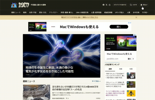 前からリクエストをいただいていたカラパイアの画面の色ですが、ご要望にお応えして「ライトモード」と「ダークモード」をボタン一つで切り替えることができるようになりました。 画面右上にある「明るさ」ボタンをスマホやタブレットならタップ、PCならクリックすることで、いつでもどこでも、どのページからも切り替えることができます。 是非試してみてね! 続きを読む… この記事のカテゴリ:まとめ・雑記 / 知る Source: カラパイア 投稿ナビゲーション 【新潟】「お前、どこ町だ?」 買い物中の男子中学生に因縁をつけ…3人を暴行の疑い 49歳無職男を逮捕 「不倫ではなくセクハラ」女性職員が訴え ”上司(市長)と部下(秘書)で交際断れず” 福岡県田川市