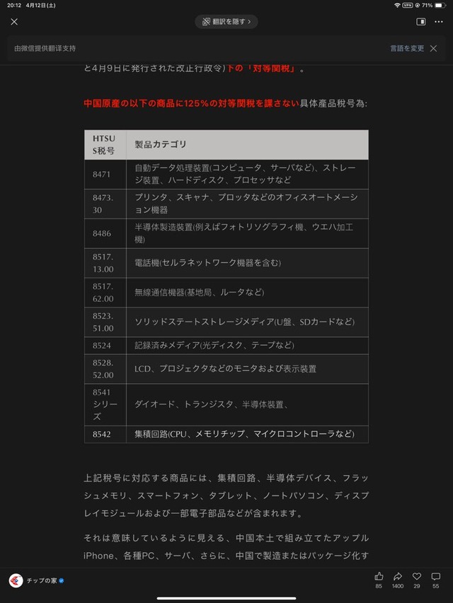 1: 名無しさん@涙目です。(大阪府) [ヌコ] 2025/04/12(土) 23:18:45.95 ID:fpnvoREN0● BE:382895459-2BP(2000) 金持ちに有利なようにやりたい放題や アメリカ税関告知 https://content.govdelivery.com/accounts/USDHSCBP/bulletins/3db9e55 突然!トランプ氏は、中国の電子製品や電子部品の一部に対して125%の関稅免除を発表した。免除品目表(芯片之家 続きを読む Source: 哲学ニュースnwk 投稿ナビゲーション 笑った画像を貼って『アラルちゃんぬりえ』 中国Anker、米Amazonで一斉値上げ スマホ充電器など