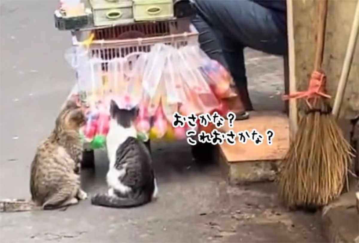 2匹の猫たちは露天商が商品としてカゴにぶら下げていたものに夢中になっていた。膨らましたビニール袋の中に、彼らを惹きつけてやまないものがあったのだ。 逆にこの露天商は、サクラ要因としてこの猫たちを雇っていたのかどうかはわからないが、猫たちが仲良く並んでじっと見つめているその姿は、通行人の興味を惹きつけたことだろう。誰も通ってないけども。 続きを読む… ▼あわせて読みたい ・水槽の中に猫が!?魚に囲まれながら至福のひと時を過ごす猫 ・いなくなっちゃった…大好きな魚が死んで悲しむ猫を励ますため、新たな仲間を迎え入れる ・水槽にいる魚に戦いを挑む猫と、それを傍観する魚 ・史上最強のサクラ。ストリートミュージシャンの演奏に聞き入る4匹の子猫(マレーシア) ・これはどうみても助けてますわ。猫氏、魚を助け颯爽と去っていく この記事のカテゴリ:動物・鳥類 / 動画 Source: カラパイア 投稿ナビゲーション 日本人めっちゃ働いてるのに経済良くならない理由、たぶん「サービス過剰」じゃね? アウターゾーンという誰も知らない語らない、ワイしか知らない漫画