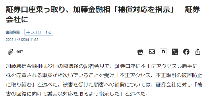 加藤金融相、フィッシング引っかかった客に証券会社が損失補填とかあり得ないこと言いだしとんな