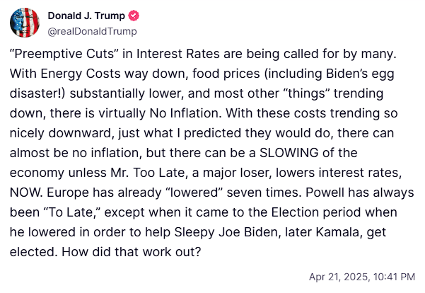 「パウエル氏は常に遅すぎた。選挙期間中は、スリーピー・ジョー・バイデン(後にカマラ)の当選を助けるために利下げしたが、それ以外は。あれはどうなったんだ?」 pic.twitter.com/NZIP5MWEot— catcarer $DJT (@greenaquos3) April 21, 2025
