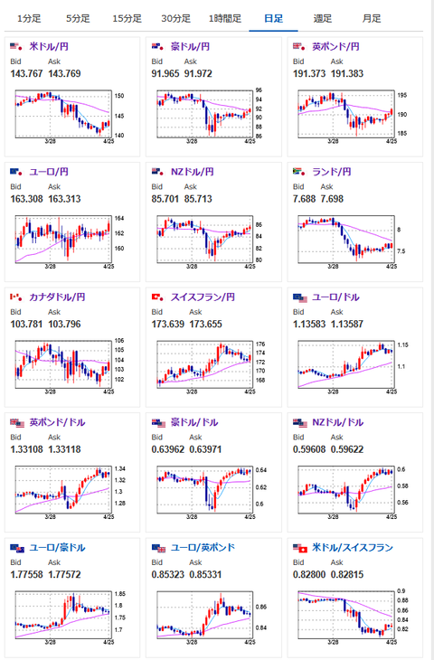 1: 以下名無しさんに代わりまして管理人がお伝えします 1848/01/24(?)00:00:00 ID:money_soku 2025年04月27日21時43分取得: 1001: 以下名無しさんに代わりまして管理人がお伝えします 1848/01/24(?)00:00:00 ID:money_soku 先週はベッセント氏の為替レートへの言及がなかったため、ドル円は急激に反発し143円台後半へ。 現在読売新聞の報道か、それともトランプ氏の休日中の発言かで、サンデーは少し円高に振れているお。 来週はどのような動きになるかはあまり読めず。 出てきた材料を見つつ適宜判断となりそうだお。 やる夫より:ニュース速報TwitterList、情報収集先などの記事だおやる夫の投資情報収集先あれこれ(2025年04月10日速報twitterlist更新)管理人のTwitterでも相場に関して出来る限りお答えしますとのことxmにて入金額倍増キャンペーンみたいだお 続きを読む Source: 稼げるまとめ速報 投稿ナビゲーション 【画像】41万で木の板買いました、先程振り込みました 【悲報】反AIさん、3年活動したのに何の成果もあげられない