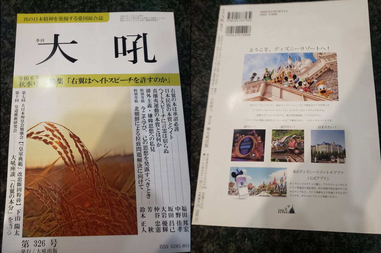 稲川会傘下の右翼団体である大行社の機関誌「大吼」を見てたら、裏一面にディズニーリゾートの広告が。