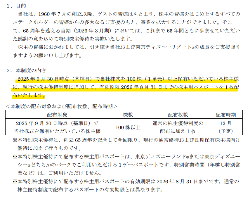 2025/04/28 オリエンタルランド株主優待制度に関するお知らせ「これまで65年間ともに歩ませていただいた感謝の意を込めて特別株主優待を実施いたします」