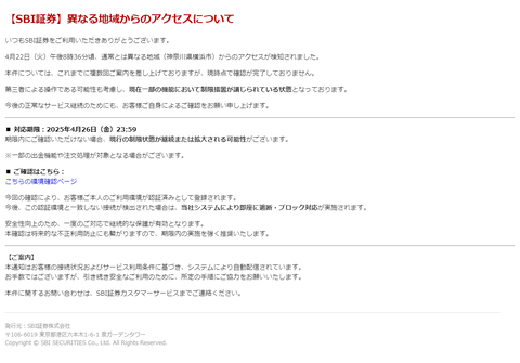 ネット証券→不正ログインで乗っ取られる対面証券→睡眠薬を盛られて火をつけられる貸金庫→行員に盗まれる家に置く→闇バイトが強盗に来る 令和の資産管理はどうすればいいんです? — ヒッポAM,CCC (@hippoasset) May 1, 2025 乗っ取りのやつ、受け手もそれなりに口座に資金が必要なんだけどどうやりくりしてるのかなあ。まとめとくと捕まった時に全部無くなるだろうし。口座に数十億もあるならもう詐欺するなよと思うけれど、そうするとやはり組織的な犯行なんだろうな。 — ますぷろ (@maspro) April 30, 2025 SBI証券を偽装したフィッシングメールうちにも来たわどうもブエノスアイレスのサーバーから来ているみたい pic.twitter.com/Z7RaJFbgRP — あらいずみしぃ🐟 (@observer_jp) May 2, 2025 フィッシングメールの訓練でも3割~4割が普通に引っかかっとるよな、残念ながら引っかかる奴は引っかかる、特に最近のは巧妙すぎる。 — ころぼっくる (@ninja_ez) May 2, 2025 この規模だと、もうフィッシングだけじゃ流石に説明つかんな。ウィルス感染やハッキングなのか、証券会社側のセキュリティホールのせいなのか、あるいは全部か — おぶつ (@obutu19) May 1, 2025 不思議な事に、「フィッシングには引っかかっていない」等々は出てくるんだけど、「エロ動画サイトは見てない」って情報が一つも出てこない。 — is (@heisenberg1934) May 1, 2025 エロサイトからのパスワード流出説が囁かれる中、エロサイトやめるか投資やめるかで投資やめる宣言してる紳士おって草 — ちゃわんご@投資の沼 (@chawan_wabita) May 1, 2025 口座乗っ取りの補償の話、タイミングがタイミングなせいで億トレが乗っ取られたから仕方なく補償しますって見えて凄い印象悪い — あろれの抜け殻 (@alorest_b) May 1, 2025 2025/05/02 日本証券業協会 今般のインターネット取引サービスにおけるフィッシング詐欺等による証券口座への不正アクセス等による対応について https://www.jsda.or.jp/ 日本証券業協会「約款なら払う必要がないところを各社にやって頂いている」 ‥は?? — 猫猫 (@tetsubin14gou) May 2, 2025 一般投資家 不正された!→「約款変更」テスタ 不正された! →「補償します」 — 増井 (@miraclemasui) May 2, 2025 「約款上は払う必要はない」これを前提に話を進めるのはズルいでしょ。 被害初期に秒速で一方的に証券会社側で決めた約款だよ? — 猫猫 (@tetsubin14gou) May 2, 2025 頼む!なにかの間違いで俺のこの負け分も不正取引の保証対象になってくれ!!! — Saga (@xSagax) May 2, 2025 どこの補償も一定のって書いてあるな — たかぴー (@takahirokabuu) May 2, 2025 各社一定の補償ってのは仕方ないと思うけどもその割合とかわからないと全然安心してトレードできんなw — 急騰🐣 (@kgbukabu) May 2, 2025 仮に補填上限1000万とか決められたら2000万くらい資金入れてる人で信用口座開いてたら6000万の20%とかで超えてまうな今日のウィルソンの1.2億やられで1000万とか補填されても…てなるし — 急騰🐣 (@kgbukabu) May 2, 2025 https://kabutan.jp/stock/chart?code=9610 ちょっと想像してみればわかるけど、証券会社の顧客てめちゃくちゃめんどくさい人いーーーっぱいおるから、予防線張りたくなるのは理解できる ただこれじゃ出金してる人が安心してトレードできるので戻ろとはならんよね — 確認用 (@news9111) May 2, 2025 証券会社が「うちは不正アクセス被害全額補償します!」って謳うのはそれだけセキュリティに自信あるんだろなあって宣伝にはなるよね — もちベーコン (@qxqxqxaquas) May 2, 2025 楽天証券「一定の補償はする。するが…具体的な金額は定めない…我々がその気になれば楽天ポイントによる補償もある…ということ…!」 pic.twitter.com/ZA6tpvFCbr — 株ゴリラ (@gorillataxjp) May 2, 2025 賭博黙示録カイジ 全13巻 不正取引の原因がわからない内から被害補償するってのも変な話だがね少額の補償金を受け取るために長文の契約に同意させられて「本件につき今後一切の訴訟等は行わないものとする」とか一文が入ってそう — platinum (@platinum_1103) May 2, 2025 証券各社が被害補償に合意したが東証にも懲罰的に補償費用の負担させた方がええこういうオーダーを平気で受け付けてかつ手数料取ってるしな犯罪のカネと分かって受けてるから組織的犯罪処罰法でしばいてくれ — ぷっちょ (@puchogen) May 2, 2025 乗っ取りによる不正売買もX(旧Twitter)のなりすましやスパムも全然改善しないのは、共通して東証や中の人達がめんどくさがってやりたがらないからだよね 放置してても自分たちは困らないどころが儲かってるんちゃう? — さるたろ (@super_sarutaro) May 2, 2025 金融庁と証券業協会と取引所と各事業者でお見合いした結果のポテンヒット的な趣のあるオンライン証券セキュリティ問題 — 銀髪推進派 (@alpaka) May 1, 2025 いいから全員対策しろよ — 銀髪推進派 (@alpaka) May 1, 2025 Source: 市況かぶ全力2階建 投稿ナビゲーション やっぱり料金請求しません 中日本高速道路、ETC障害で 53歳の男が女児の頭を叩き脳神経を損傷させる