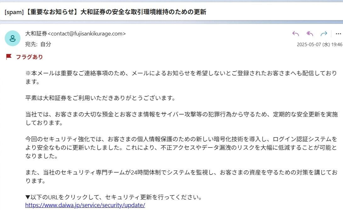 自称SBI証券からフィッシング詐欺・不正アクセスによる損害の補償をするから今すぐこのURLをクリックして補償申請をしてほしい期限は今月末みたいなフィッシング詐欺メールが来た。