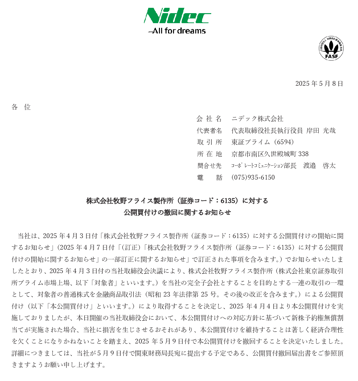 ニデックが牧野フライス製作所への公開買付けの撤回を公表 pic.twitter.com/nGV8O9oL8y