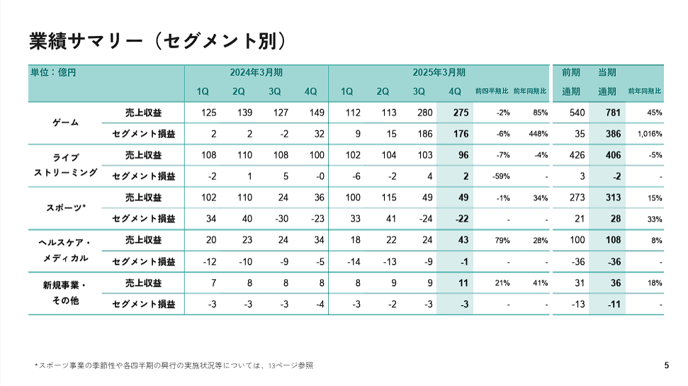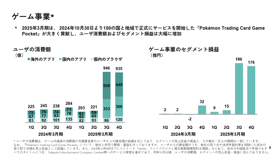DeNA、ポケポケ特需で3Q/4Qのゲーム事業は爆益。スポーツ事業は3Q/4Qの売上が増えているのはいい兆候か。ライブストリーミング事業は通期で赤字へ。。 pic.twitter.com/WfsdZ7D65o