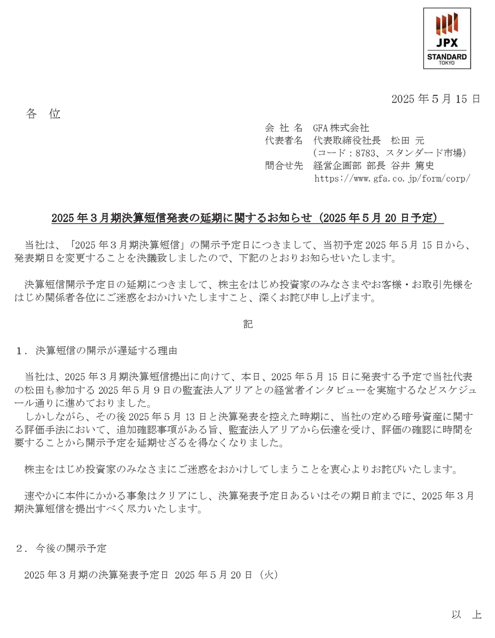 「2025年5月13日と決算発表を控えた時期に、当社の定める暗号資産に関する評価手法において、追加確認事項がある旨、監査法人アリアから伝達を受け、評価の確認に時間を要することから開示予定を延期せざるを得なくなりました」