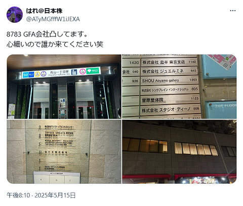 決算出てなくて会社凸する人マジで怖い… — ishikawa84g (@ishikawa84g) May 15, 2025 応接室まで行ったっぽい。刺激しないようにして警察呼ぶのが正しいと思う… — ishikawa84g (@ishikawa84g) May 15, 2025 めちゃくちゃ面白い — もちベーコン (@qxqxqxaquas) May 15, 2025 Nutsの診療所かなんか凸った人を思い出したわ — たかぴー (@takahirokabuu) May 15, 2025 ※Nutsの周辺が物騒、会員制医療施設が「保健所の名を騙る不法侵入」で開業延期(2019/03/30) アポ無し凸して許されるのはかぶ1000さんまでだよ!! — 確認用 (@news9111) May 15, 2025 ※宇野澤組鐵工所、アポなし突撃訪問に対応した総務一筋の部長が謎の異動(2019/06/27) バカなやつにも対応してるの流石上場企業なのかもしれない。(違 — たかぴー (@takahirokabuu) May 15, 2025 GFA、暗号資産に関する評価手法について監査法人より追加確認事項。決算延期。 pic.twitter.com/Dv1qU86zo0 — 空き缶 (@akikankeri) May 15, 2025 https://www.gfa.co.jp/「2025年5月13日と決算発表を控えた時期に、当社の定める暗号資産に関する評価手法において、追加確認事項がある旨、監査法人アリアから伝達を受け、評価の確認に時間を要することから開示予定を延期せざるを得なくなりました」 決算って決算発表当日まで監査法人と揉める感じなの? — anne (@stupiddialog) May 15, 2025 https://www.release.tdnet.info/ やはりミームコイン→受増益→爆益のスキームはさすがのアリアでも監査法人としてのポリシーで超えることができなかったのかだろうか…ミームコインに活発な市場があれば問題なさそうな気もするけど、実際どのくらいの取引量なんだろう。 — ヨコワケ🐼🎋シャンシャン✨黄金は諦めそうなその先に。 (@ShiningBlue_SKY) May 15, 2025 GFAあんたそのにゃんまるコインの評価額ほんとなんすかみたいなやつか — M (@re_ze_rou) May 15, 2025 そもそもその監査法人ってまともなん? — コマ( )🍭🛼 (@KOMA_grease) May 15, 2025 監査法人アリアで面白い — anne (@stupiddialog) May 15, 2025 ゴミ株が決算延期しても何の驚きもないのでサプライズではないよな — 天気 (@_tenki_no_ko_) May 15, 2025 https://www.sbisec.co.jp/※夜間取引市場で下落が加速 延期かーいちゃっかり借入もセットで出してるのおもろ — ととねをぃ (@toto198674) May 15, 2025 よくわからんけど、GFAって自転車操業なの? pic.twitter.com/p5enarcg5g — のらさん (@norasan996996) May 15, 2025 https://www.gfa.co.jp/ 固定金利10%と15%、借入先非開示。一度だけでなく二度三度も pic.twitter.com/OnGhIHf82A — anne (@stupiddialog) May 15, 2025 半沢直樹 DVD-BOX GFA暗号資産盗まれましたにもっていくための自作自演とは疑いたくない。 — M (@re_ze_rou) May 15, 2025 https://kabutan.jp/stock/chart?code=8783 Source: 市況かぶ全力2階建 投稿ナビゲーション バフェット氏、CEOから退任した理由がこちら 24年の出生率、民間試算「過去最低の1.15」 少子化に歯止めかからず