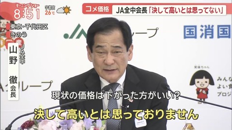 ワシには分かる、「今年の漢字」もう絶対「米」だろ。 — 野瀬大樹 (@hirokinose) May 16, 2025 【決して高くない】コメの価格について、全国農業協同組合中央会(JA全中)の山野徹会長「決して高いとは思っていない。生産者にもつくる側にも消費者の方にもお互いに納得いけるような価格というのが適正価格であろう」 pic.twitter.com/tn4JOjcdin — Mi2 (@mi2_yes) May 13, 2025 総理、官房長官、幹事長が農水大臣経験者なのにコメに対して為す術がなくなっている政権 — あるぱか6世 (@nemmumizawa) May 19, 2025 コメが高いなら貰えばいいじゃない。 — さるま (@salma_ya_salama) May 19, 2025 【コメを買ったことはない、売るほどある】江藤拓農林水産大臣は講演で「私はコメを買ったことはありません。支援者の方がたくさん米をくださるので、まさに売るほどある」 このご時世で、じゃ大臣売ってくれよってなるよね…なんだかなぁ pic.twitter.com/QaIh8Vx7KA — Mi2 (@mi2_yes) May 19, 2025 江藤大臣の言いたいことがよく分かりませんが、「俺は米に困ってないが国民のことは知らんわ。」という要約で合ってますかね。 — Yuz (@yuz75741) May 19, 2025 コメを買ったことがない人が農水大臣になれる国なので、無職の自分も厚生労働省のトップになれるかもしれない — ひきこうもり (@Hikikomori_) May 19, 2025 おコメは買ったことがないおコメの消えた街角でかなり値段を乗っけられても急に麦を混ぜられても怖くなかった — DJあかい (@DJakai2) May 19, 2025 Ado「飾りじゃないのよ 涙は」 「コメ買ったことない」より、「売るほどある」のほうが個人的にはヤバいと思う戦前だったら打ちこわしされてる — あるぱか6世 (@nemmumizawa) May 19, 2025 講演会とかでウケ狙い舌禍炎上、絶えないよなあ — 上様R (@u_e_summer) May 19, 2025 江藤みたいな農水族のエース格がこんな舌禍をよりにもよってコメ問題で起こすなよ — 舞えない兵庫 (@saigaku_gokokku) May 19, 2025 そもそも支援者から米もらうの、収賄じゃね? — ひねもすのたり、のたれ死に (@moonlight_NTR) May 19, 2025 農水大臣が支援者から米をもらった、か。政治資金規正法とか、どうなるんだろうな — ○イジー (@daisycutter7) May 19, 2025 消えた20万トンのコメ、江藤農相の家にある可能性出てきたな — さけのみ犬 (@w3upi9yXjnhUcLR) May 19, 2025 なんか政権末期って感じだなぁ — しば (@UYC23mgjbeLVVh4) May 19, 2025 まー普通に考えて、よりによって主食を安定供給できない政権が選挙で勝つ目は無いわね — kaoruww (@kaoruww) April 22, 2025 江藤農水相が自宅の備蓄米放出を宣言し、一気にコメが出回る回 — イナバX❤ (@soonsoul) May 19, 2025 https://kabutan.jp/stock/chart?code=2700 Source: 市況かぶ全力2階建 投稿ナビゲーション 【悲報】農水省「すまんね、またコメの最高値更新したwwwwwwwwwwwwwww」 【驚愕】ポケモンカードがまた値上がりってマジ!?