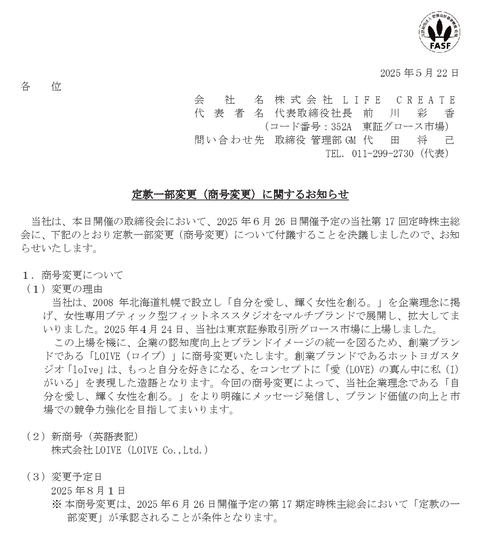◆クソ株チェックリスト◆・社名ロンダリング・本社が不相応な一等地・役員一同で腕組み・社長はろくろ回し・浮動株じゃぶじゃぶ・優待で高額QUOカード・謎IR・掲げる時価総額目標が宇宙・社長も意識高いSNSで宇宙へ・しかし上場ゴールで株価急降下・そして株主の財布がブラックホールに — 急樂 (@0110110w) May 14, 2025 クソ株3要件 業績がクソ経営陣がクソ株価がクソ これを満たさなければクソ株認定されません(・ω・) — ほいみん (@takechan0720) December 17, 2024 上場して1ヵ月も経ってないだろ。名前なんて重要な事はもっとよく考えとけよ。 LIFE CREATE → LOIVE — のんびりとうしSRS(LC4300万) (@srs20170526) May 22, 2025 2025/05/22 LIFE CREATE 定款一部変更(商号変更)に関するお知らせ https://be-lifecreate.com/『上場を機に、企業の認知度向上とブランドイメージの統一を図るため、創業ブランドである「LOIVE(ロイブ)」に商号変更いたします』『「loIve」は、もっと自分を好きになる、をコンセプトに「愛(LOVE)の真ん中に私(I)がいる」を表現した造語』 上場前にしといてw — 確認用 (@news9111) May 22, 2025 LOIVEってなんかいかがわしい系のサービスかと思ってしまったwww — メコン川幸子 (@madoumeko) May 22, 2025 フィットネス業界はこれから、男はエニタイムとかチョコザップに通い、女性はピラティスの時代だと思う。たぶん、女性は普通のジムに通ってて「何か違うんだよ感」を覚えてボクシングとかピラティス、ヨガに移っていくと見てる。嫁がピラティスピラティス言い出したのも地味にデカい笑 — てつ@株メシ (@kabumeshi) May 22, 2025 ピラティスとホットヨガの違いが解らない。 — tky (@tky82737408) May 8, 2025 ※2025年3月期 通期決算説明資料 ホットヨガスタジオは増えてなくて、現状はピラティススタジオ急速に増やしているのね。 pic.twitter.com/x3eYyT48R3 — 空き缶 (@akikankeri) March 22, 2025 元すすきのの高級クラブのママ社長がIPOする時代か。来店客の社長たちにノウハウを取材、経営学を吸収したとかバリおもろい。女性向けフィットネス事業展開のLIFE CREATE。東証にタレコミとかきたりするのかな。 pic.twitter.com/GUR859kKMa — ミータソ@スタートアップ会計士 (@DeadFinanceCXO) March 21, 2025 https://venturetimes.jp/「若くして札幌市すすき野の高級クラブで働き、22歳でママのポストに就く」 戦闘力高そうw — 石野 優太@デアベルスインベストメント代表 (@Dea_Bellus0701) March 21, 2025 LIFE CREATE社のHPで代表の経歴見たけどすすきのの高級クラブのママだった件は一切書かれず、専業主婦から成り上がった女性社長というブランディングにされてる模様(´・_・`) pic.twitter.com/VkMZ7En3iU — RK (@kawauchi_co) March 21, 2025 https://be-lifecreate.com/「専業主婦の後、仲間とともに2006年北海道発のホットヨガスタジオをオープン」 ホットヨガはあのリキッド・オーディオ・ジャパンが最期にたどり着いた事業なんで、まぁ、そう言う種類のモノなんだろうと言う強い偏見がある。 — ボヴ (@cornwallcapital) October 3, 2024 https://kabutan.jp/stock/chart?code=352A Source: 市況かぶ全力2階建 投稿ナビゲーション 【悲報】中居正広さん、逝く 農林中金、赤字1兆8千億円