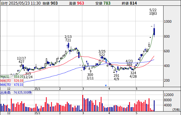 伝説作ったな。PTSで2283円の4倍ストップ高タッチから783円ストップ安タッチって生涯見れないかも知れないレベル。しかも時価総額4000億。