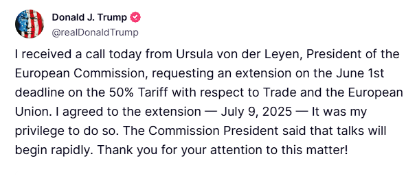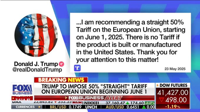 対EU50%関税発動延期(6/1→7/10)の件、取り急ぎ「50%ではなさそうだ」という想起を呼び込んだ点はポジティブ。VDLがかなり奮闘した模様。なお関税の終着点については、一律10%(対中30%)残しが濃厚。ゴールはなんとなく見えるものの、過程は極めて不透明。時間稼ぎでリスクオンなら完全にお花畑相場。
