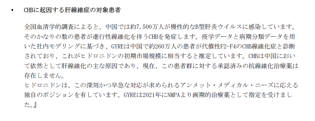 「B型肝炎に起因する肝線維症治療薬としてヒドロニドンの迅速承認を求める予定」