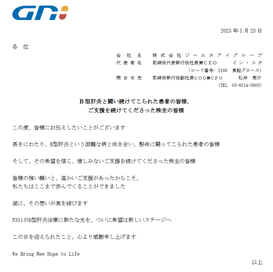 2025/05/23 ジーエヌアイグループ肝線維症治療薬F351中国における第3相臨床試験の結果についてhttps://www.gnipharma.com/