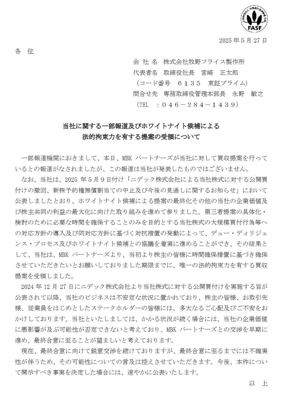 2025/05/28 牧野フライス製作所当社に関する一部報道及びホワイトナイト候補による法的拘束力を有する提案の受領について「MBKパートナーズとの交渉を早期に進め、最終合意に至ることが望ましいと考えております」「現在、最終合意に向けて鋭意交渉を続けておりますが、最終合意に至るまでには不確実性が伴うため、その可能性についての言及は控えさせていただきます」