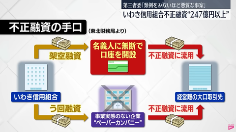 隠匿・虚偽説明という言葉があまりにポンポン出てきて目が潰れそう。 — リアル世界観 (@real_do_estate) May 30, 2025 https://www.youtube.com/ 大口先が約定弁済が出来なくなったから、印鑑まで偽造して全くの他人がお金借りたことにして、そのお金を大口先に振り込んで弁済に宛てたってことですよね。こうやって書いてても意味が全くわからない。一線どころか何線も超えてる。 — やきとり副係長 (@yakitori_8) May 18, 2025 虚偽という言葉が82回、隠蔽という言葉が104回出てくる。読みがいがありそう。 pic.twitter.com/UqHiSRUVZV — やきとり副係長 (@yakitori_8) May 30, 2025 え、不正発覚の経緯て検査、クレーム、外部通報、内部通報の類じゃなくて、全信組連の支店がXランドで見つけてきたってマジで? pic.twitter.com/vIT2wO4aKA — S Rina (@Cate_S_Rina) May 30, 2025 いわき信用組合、序盤でもうヤバいんだけど…調査妨害しまくってる pic.twitter.com/H5DrTDhnzH — 空き缶 (@akikankeri) May 30, 2025 調査妨害だけでこんだけのページ数… pic.twitter.com/HqtKnyfRy1 — 空き缶 (@akikankeri) May 30, 2025 反社の末端組織やん — とくそん (@tokusonn) May 30, 2025 本当に不良債権の認識を遅らせるためだけか?謎の利益供与とか反社に金が流れていたりとかないか? — リアル世界観 (@real_do_estate) May 18, 2025 『無断借名融資』という新語が続く中、「言われたとおりにやればいい」「会社にいたいのであれば触れないように」「会社にいたければ黙っているように」って、ドラマみたいね。半沢直樹もびっくりよ。 pic.twitter.com/xZ3vizKD4j — jo (@jgtk_2008) May 30, 2025 やばいデータの入ったノートパソコンは自宅に持って帰ってハンマーで叩き壊しました。自分の意志でやりました。いわき信用組合って気合い入ってんな。 pic.twitter.com/g8V7DfkfsV — わたぬき (@wtnk7772) May 30, 2025 いわき信用組合の不正融資、無断借入に対する通知を事前に郵送を防ぐ隠蔽工作をやってたみたいだな。事務処理機関からの通知を本部で握りつぶす方式 pic.twitter.com/OvdekY6exw — (๑╹◡╹๑) (@tsuchie88) May 30, 2025 名寄せからの発覚を防ぐために、架空の生年月日を使ってCIFを二重登録する方法も。ここまでくると真っ黒やんけ pic.twitter.com/tk9p82c2wv — (๑╹◡╹๑) (@tsuchie88) May 30, 2025 無断借名融資を返してくれないことに懸念を持って債務承認をさせようとしたり、会社の実印と権利証を金融機関側に引き渡させようとしたり。質権とかいうチャチなものじゃない、もっと恐ろしいものの片鱗を味わせてくれる。 pic.twitter.com/NM0hGRpGb5 — やきとり副係長 (@yakitori_8) May 30, 2025 本当の名義人が残高証明とか取って借名融資がバレそうになったら「融資拡大の必要性があり、職員が独自に名義を借りて実行しました」と謝罪して逃れるだと。。。 pic.twitter.com/cjoKCl98oS — やきとり副係長 (@yakitori_8) May 30, 2025 横領発覚したのに本部の現金勘定を使って穴埋め、監査法人が来る時は別の店から現金持ってきて隠蔽、その現金が足りない分を借名融資で捻出して解消…考え得る手法を総動員してる感がある。組織的に本気でやると、ここまで出来るんだなと感心する。 pic.twitter.com/Y9zVM99WOc — やきとり副係長 (@yakitori_8) May 30, 2025 口裏合わせに捏造… pic.twitter.com/uRMdSUjGZ1 — 空き缶 (@akikankeri) May 30, 2025 監査部長が独断で虚偽説明と口裏合わせをしたというストーリーで乗り切ろうとして説明に合理性がないし悪質なパワハラだろって指摘されてるの好き。 pic.twitter.com/Vp8f5uxKci — tnihei (@tnihei) May 30, 2025 財務局への虚偽説明、本部把握してるのに当時の支店長が独断で隠ぺいしてたことにしてるし…全信保連にも虚偽説明してるし… pic.twitter.com/0Yt1HSX4k0 — 空き缶 (@akikankeri) May 30, 2025 第三者委員会の所属事務所でヒアリングしようとしたら「監視されてる」「盗聴されてる」と疑いだす職員、もうヴォルデモートみたいになってる(‘ε’*) pic.twitter.com/UVFBJCt1Fl — 遊撃部長F/S&RWAs (@fstora) May 30, 2025 東日本震災後の2012年、いわき信用組合には、公的資金175億円が税金から注ぎ込まれている。 国が助けてくれると、調子に乗ってしまったんじゃなかろうか? 安易な救済はモラルハザードを引き起こす。 — 満州中央銀行 (@kabutociti) May 18, 2025 全容解明のために更なる調査を要する状況にあるけど任意調査による全容解明には限界あるってことは捜査機関にお出まし願うしかないってことだよね。自宅にガサかけたり身柄取られたりしたら元理事の人達ももうちょっとお話しする気になってくれるってことだよね。 pic.twitter.com/ePoiX37SCw — tnihei (@tnihei) May 30, 2025 いわき信用組合、もうここはみずほ銀行が救済して、福島みずほ信用組合に — (๑╹◡╹๑) (@tsuchie88) May 30, 2025 Source: 市況かぶ全力2階建 投稿ナビゲーション 野村元農相、小泉氏に苦言 「自民部会諮らず発表」「自分で決めて自分で発表してしまう。ルールを覚えてもらわないといけない」 株の配当とかいうのクソすぎだろ