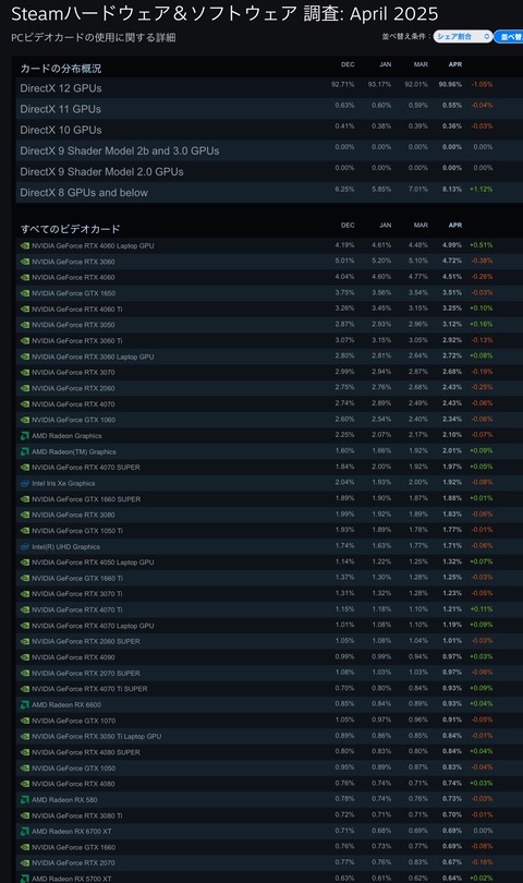 1: 稼げる名無しさん :2025/06/01(日) 08:59:08.18 ID:0YYLeprK0.net Steamユーザーもそんなハイスペック求めてない模様 2: 稼げる名無しさん :2025/06/01(日) 08:59:49.75 ID:Lf6qRaiI0.net そらPCもカジュアルユーザーが多数派だからな 3: 稼げる名無しさん :2025/06/01(日) 09:00:23.90 ID:ewtmuKq6M.net そりゃ軽いインディも売れてるじゃん 1001: 以下名無しさんに代わりまして管理人がお伝えします 1848/01/24(?)00:00:00 ID:money_soku ゲーム用グラボはRTX4060を買っておけば暫く安泰かも。AIをやるなら5090という感じで。 NVIDIAはどんどんハイスペックかつ高価格帯路線にいきそうだし、ゲーム用途であれば突き詰めないほうがコスパは良さげだな。 デスクトップ用はこちら: MSI GeForce RTX 4060 VENTUS 2X BLACK 8G OC グラフィックスボード VD8560 GIGABYTE NVIDIA Geforce RTX5090 搭載 グラフィックボード GDDR7 32GB【国内正規代理店品】GV-N5090GAMING OC-32GD ノートPCはこのあたりがコスパが良いかとスマイルセール対象 【Amazon.co.jp限定】 ASUS ゲーミングノートPC TUF Gaming A15 FA507NVR 15.6インチ RTX 4060 Ryzen 7 7435HS メモリ16GB SSD1TB リフレッシュレート144Hz RGB イルミネートキーボード Windows 11 動画編集 PC Game Pass 3ヶ月利用権付き イェーガーグレー FA507NVR-R74R4060T 続きを読む Source: 稼げるまとめ速報 投稿ナビゲーション EU、鉄鋼関税にブチギレで対抗措置か ミニPCって凄くない!?