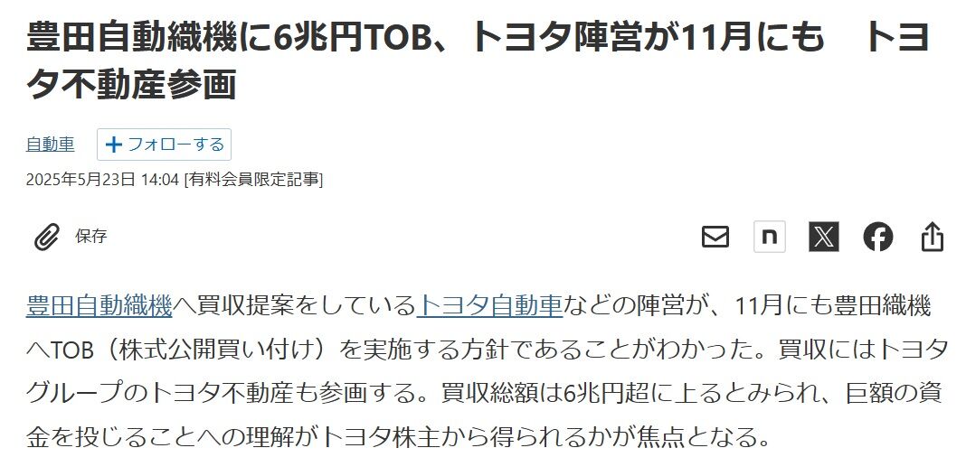 5/20「豊田自動織機TOBは6兆円超!」by日経新聞