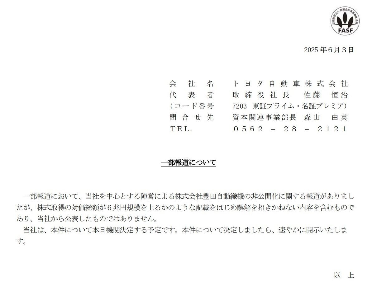 リーク後に株価がTOB価格を遙かに超えて暴騰してたから、ちゃんと警告しとかなきゃと思ったんだね。やさしいね、トヨタ。