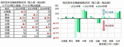 1: 2025/06/04(水) 10:33:38.96 本社移転が活発化、「東京脱出」の傾向顕著に 7割が黒字企業 – ITmedia ビジネスオンライン https://www.itmedia.co.jp/business/articles/2506/04/news007.html 2025年06月04日 08時00分 公開 [コネムラメグミ,ITmedia] 東京商工リサーチの調査で、2024年度に他都道府県に本社・本社機能を移転した企業は1万6271社で、前年度比18.7%増と大きく増加したことが分かった。コロナ禍の落ち着きに伴って経済活動が回復基調に乗ったことで、本社移転の動きも活発化している。 本社移転した「資本金1000万円以上」の企業は2809社(同17.4%増)で3年ぶりに増加、「資本金1000万円未満」は1万3462社(同19.0%増)と3年連続で増加した。前年度は小・零細企業の本社移転が件数を押し上げたが、今年度は中堅規模以上の企業でも移転が増えた。 本社が多く移転したエリアはどこか。転入超過数のトップは「九州」で148社だった。TSMC(台湾積体電路製造)の九州進出で製造業を中心に活況が続き、設備・IT投資も活発化した影響が考えられる。製造業と情報通信業の2業種は、九州の全8県で転入超過となった。半導体に加え、自動車の主力工場の進出が関連企業や取引先の吸引力を強めた。 次に「中部」が147社と続いた。関東、近畿どちらへも商圏を広げやすく、特に関東からの転入が目立った。中部5県のうち、愛知県(20社減)を除く4県で転入超過だった。 一方、転出超過だったのは、関東(284社減)、近畿(96社減)、四国(3社減)の3地区だった。特に関東の転出超過数が多く、地方への流出に歯止めがかからず、4年連続で転出超過となった。 県別でみると、転入超過1位が「埼玉県」だった。転入が1507社に対し、転出は1257社で、差し引き250社の転入超過であった。主に東京都からの転入が多く、2年連続で転入超過数が大幅に増加。産業別では、「サービス業他」が100社増で転入超過数が最も多く、「農・林・漁・鉱業(超過数ゼロ)」を除く9産業で転入超過となった。 転入超過2位は、「千葉県」で192社増となり、前年度1位から2位にランクダウンした。埼玉県と同様に東京都からの転入超過が中心で、産業別では、「卸売業」が56社増で転入超過数が最多。「金融・保険業」と「運輸業」を除く8産業で転入超過だった。 転出超過数1位は「東京都」で、1158社減という結果に。産業別では10産業すべてで転出超過となった。転入数は2022年度3723件、2023年度3983件、2024年度4584件と増加が続く一方、2023年度に減少した転出数が再び2024年度に増加に転じ、東京都から隣接する埼玉県、千葉県、神奈川県への流出が強まった結果、転出超過数が再び増加した。 ほかに、「大阪府」は264社減、「愛知県」が20社減と、大都市圏の中心部から周辺都市に転出する傾向が目立った。 本社移転した企業の7割は黒字企業に (略) ※全文はソースで。 続きを読む Source: 投資ちゃんねる – 株・FX・仮想通貨・投資2chまとめ 投稿ナビゲーション 約500億円投じた“アベノマスク”の契約経緯めぐる文書の不開示決定『取り消し』命じる判決 国は「存在しない」主張も 大阪地裁 【東京】男性作業員(22)が地上から約3m下に転落…顔から胸に鉄筋刺さり搬送先の病院で死亡