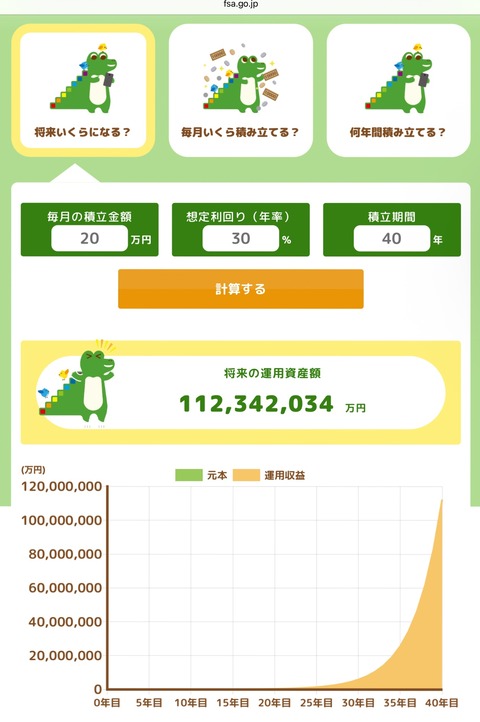1: 2025/06/11(水) 22:38:06.94 「金融庁公式」ツールの試算や なんら成果を保証するわけではないが、正しい方法で積み立てればこんだけになるってことやな。 続きを読む Source: 投資ちゃんねる – 株・FX・仮想通貨・投資2chまとめ 投稿ナビゲーション ゲーム系Youtuberさん「YouTuberの広告収入が激減…このままではみんな引退ですよ」 【朗報】米価爆下げキタ━━━━(゚∀゚)━━━━!!