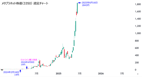 日本の上場企業メタプラネットがビットコインの追加購入を発表し、保有枚数が1万枚に到達しました。 株価は1年4ヶ月で131倍🚀ビットコイン購入発表から1年2ヶ月で97倍になりました。 pic.twitter.com/bXuEUh0zJQ — アンゴロウ@暗号資産 (@angorou7) June 16, 2025 ワイがビットコイン買っても資産価値は変わらない(資産が円からビットコインに変わるだけ)のに、どうして会社がビットコインを買うと会社の価値(時価総額)が上がるの? — Rob (@txjmdagjmwtjm) June 12, 2025 https://finance.yahoo.co.jp/stocks/ranking/marketCapitalHigh※ヤクルト>阪急阪神>資生堂>メタプラネット(時価総額9457億円)>明治>住友林業 説明できないが上がってるのがええんやろ。説明出来てしまうと夢は無くなる。 — 増井 (@miraclemasui) June 8, 2025 1000億円の金塊や不動産を所有している”だけ”の企業の時価総額が1兆円だったらそりゃ過大評価としか思えない — あらいずみしぃ🐟 (@observer_jp) June 16, 2025 ほんの1年前までホテル運営で3億円程度の売上だった会社が7700億円増資するだけでも信じられないのに、調達資金でやることがビットコイン購入とか聞いてるだけで頭おかしくなりそう。とても正気とは思えないが、これが日本の株式市場なんだな… — maisonkayser.bot (@rockhound_) June 6, 2025 景品のビットコインを三店方式で換金するためのプレハブ小屋が東証 — スペさん (@kumakuma7) June 16, 2025 メタプラネット、資本市場ハックの限界を探りに行ってるな。行き着くところまで行って市場全体を巻き込んだクラッシュ、みたいなリスクを想定しておかなきゃね。 — Inside+Outside→Zone (@zone_investor) June 6, 2025 ああいうインチキビジネスモデルを許容しちゃうから投資家を馬鹿にしたやり方が横行する。行き着く先は、ならず者企業が全揃いしてやらかして規制が入ってまた冬の時代って20年前に見た光景なんだが。 — ほいみん (@takechan0720) June 6, 2025 おまいら pic.twitter.com/BzzuAJRUoQ — PON (@pon_tosyou) June 14, 2025 https://www.youtube.com/ そろそろアレのビットコイン盗まれそうだよな — 山田 (@u2yamada) June 8, 2025 https://www.youtube.com/ メタプラネットってダイキサウンドでフォンツでレッドプラネットなのか。昔の人はみんな知ってるクソ株だけど、名前変えたらわからんわな。 — たにやん (@t_taniyan) June 9, 2025 ※社名ロンダリングの歴史ダイキサウンド→フォンツ・ホールディングス→レッド・プラネット・ジャパン→メタプラネット→のぞみCo (中止) フォンツ(ダイキサウンド)で金爆がインディーズで居ったのはもっと知らん人多やろね — ぷっちょ (@puchogen) June 10, 2025 クソ株でIRやってる時に「ダイキサウンド買ったんです」って熱弁する個人投資家居たけど、もちろんお金たくさん無くしてて、今のメタプラネットの人も似た感じしますね。 — たにやん (@t_taniyan) June 9, 2025 自信満々で株を買う↓上がらない↓ビットコインは無邪気に上がる↓「フフッ。投機はしないんよ」↓持ち株だけ上がらない↓ビットコインは無邪気に上がる↓イライラしてくる↓ビットコインは無邪気に上がる↓「そうか!上がれば正義なのか!」↓買う↓天井 いつも同じです — ヤリ手ジジイ (@yaritejijii) June 16, 2025 「ビットコインが上がってくれないと困る」人たちが多すぎると大体そこがターニングポイントになるからなあ — ヨーロピアン (@sen_axis) June 16, 2025 https://kabutan.jp/stock/chart?code=3350 Source: 市況かぶ全力2階建 投稿ナビゲーション イスラエル・イラン仲介役にロシア名乗り…「平和姿勢」でトランプ政権を懐柔、制裁強化回避狙いか 超人「残業終わったしジム行くか!(PM10:00)」 ぼく「?!」