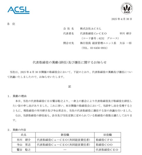 大企業の重役が何とも言えないタイミングで退任すると色々勘ぐってしまう — 鉄火場泥棒 (@lovenk225f) May 13, 2025 ACSL、一身上の都合で辞任からの一部業者と実態のない取引とは — フォレ子 (@tasukaranaihito) July 1, 2025 https://www.acsl.co.jp/「代表取締役CEO鷲谷聡之より、一身上の都合により代表取締役及び取締役を辞任したい旨の申し出がありました」 ACSL、一身上の都合で辞任していた前CEOが一部業者との間で実体のない不適切取引をしていたことをふまえて特別調査委員会を設置。同氏の個人的な経済状況に関する懸念が生じたのならそれは一身上の都合ではないやろ・・・ pic.twitter.com/Fd62x4pTIQ — 機械系のコーギー提督bot (@flltby2) July 1, 2025 https://www.acsl.co.jp/「2025年3月に元代表取締役である鷲谷聡之氏(2025年4月30日付で代表取締役及び取締役を退任)について、同氏の個人的な経済状況に関する懸念が生じた」「代表取締役の立場を個人的に悪用して、2025年3月から、一部業者との間で実態のない不適切な取引を行っていた事実が判明」 前代表が金抜いてどろんした訳ですか…ドローンだけにっつってなwwwガハハwww — もちベーコン (@qxqxqxaquas) July 1, 2025 3月にはじめて4月即バレっていうのも中々… — 空き缶 (@akikankeri) July 1, 2025 キックバック系は税務調査で発覚するの多いからアレにゃんねぇ — さわい💕_(┐💪ε:)_🍰✨ (@sawai0381) July 1, 2025 もうドローンとかまだ虚業みたいなもんやし、今材料で上げてるから、ドローン関連全部責任とっとけ(´・ω・`) — ざら速(ザラ場速報) @ときどき仮想通貨 (@ZARASOKU) July 1, 2025 https://www.sbisec.co.jp/ ※夜間取引市場で急落 ACSL黒字転換自体嘘なんじゃね?って思い始めた。。 — よっち (@BLASTMCZ) July 1, 2025 インチキドローンがゲロったら相方もやばいんじゃないのこれ — うしっクマ (@bullbear48) July 1, 2025 ※相方=GFA ※ビットコインに投機中の不動産屋GFA、代表取締役会長に内定のケンコー・トキナー山中徹さん本人からそんな事実はないと筆頭株主の予定や資金事業連携の件を含めて一切合切全否定される(2025/06/24) 「ACSL社よりブロックチェーン技術を活用したドローン飛行データ管理システム開発の発注として、当初の予定どおり金1億円を検収後に2025年4~6月時点で受領」 ACSLの見てても上場したらなんでも勝ちゲーじゃん — たかぴー (@takahirokabuu) July 1, 2025 https://www.youtube.com/ ※日本取引所グループのCMに出演したACL代表取締役社長(当時)の鷲谷聡之さん 「今考えているいろいろな固定概念のもの、こういうものを崩していくことによって、より社会を進化させられるんじゃないかと思っています」 上場前から粉飾、上場前から不正会計、ロックアップも平然と破る、でも東証は軽い罰則か注意勧告のみで済ませるなどとスタートアップ周りのモラルハザードが著しいですな〜。 — まいる (@flagcrashers) June 19, 2025 ACSL、国や自治体から仕事受けて補助金まで交付されてるのに前社長が不正取引してたとか許されていいの??NEDOや関係省庁、関係自治体に報告しておこうか? — 新垢メタスラ(ベンツマン@株式板) (@Benzman_TAKE2) July 1, 2025 https://kabutan.jp/stock/chart?code=6232 Source: 市況かぶ全力2階建 投稿ナビゲーション 【悲報】38歳こどおじだが貯金300万全額引き出してきたwwwwwwwwww 7月5日なんかある説 地震連発で信憑性増してきてる件