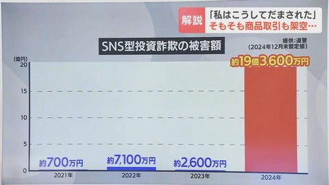 1: コイン速報がお伝えします 2025/07/02(水) 07:36:54.46 0 なぜ巨額の被害が相次ぐのか「ほとんどの貯金を使ってしまった…」SNS型投資詐欺に遭い、老後の資金2940万円を失った60代男性が語った被害の実態 ■《奪われた老後の資金》 被害にあった60代男性 「今はやりくりを考えています。ショックは大きいですよ。ほとんどの貯金を使ってしまったので残念ですね」 被害を受けたのは、老後のための資金、約3000万円です。きっかけは、去年12月28日。インターネットの語学サイトで出会った女性でした。 ◇《ネットの商品売買で15%分の儲けと誘われる》 女性が持ち掛けてきた“ネットの商品売買”とは、こんな仕組みだったといいます。 まず『高級ブランドのバッグ』や『ほ乳瓶』などを、販売価格の15パーセント引きで商品を仕入れます。 そして、それらの商品が、販売価格で売れると、仕入れた人に、15パーセント分の儲けが出るというものです。 そもそも被害に遭った男性は、どうして信用してしまったのでしょうか。 ◇《振り込まれた“100ドル”で相手を信用》 相手の話を信じてしまったきっかけは“3万ドルの利益があった”と伝えられた際、男性の口座に100ドル=約1万5000円が、実際に振り込まれたためでした。 結局、去年12月29日から今月14日までのわずか17日間で、男性は約2940万円を、相手から指定された口座に振り込んでしまったのです。 森田絹子キャスター) 警察によると、SNS型投資詐欺による北海道内の被害額は、2021年は約700万円でした。それが、去年は約19億3600万円と、276倍に急増しています。 https://newsdig.tbs.co.jp/articles/-/1697501?page=2 続きを読む Source: コイン速報 | 仮想通貨・暗号通貨・暗号資産ニュース 投稿ナビゲーション XRPは5年以内にSWIFTの支払い量の●●%を獲得すると、RippleのCEOが予測 ビットコイン初期採用者、「BTCは再び●●倍の上昇サイクルに入る可能性」