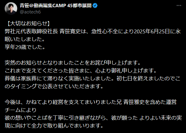 1: Ailuropoda melanoleuca ★ 2025/07/04(金) 03:46:58.41 ID:pqF2EOEU9 【大切なお知らせ】弊社元代表取締役社長 青笹寛史は、急性心不全により2025年6月25日に永眠いたしました。享年29歳でした。 突然のお知らせとなりましたことをお詫び申し上げます。これまで支えてくださった皆さまに、心より御礼申し上げます。… — 青笹@動画編集CAMP 45都市展開 (@aotech6) July 3, 2025 続きを読む Source: 哲学ニュースnwk 投稿ナビゲーション 「ダイアウルフ風オオカミ」はすくすく成長中、生後6か月で2倍の大きさに 【参院選ポスター巡り名誉毀損】立憲・石垣のり子氏がN党候補を告訴 「党の指示で掲示した」