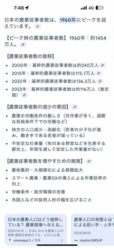 1: 2025/07/06(日) 15:05:14.50 ● BE:659060378-BRZ(11000) sssp://img.5ch.net/ico/jisakujien_5.gif 日本の農業従事者数は、1960年にピークを迎えています。 【ピーク時の農業従事者数】1960年:約1454万人。 【農業従事者数の推移】 2000年:基幹的農業従事者数は約240万人 2015年:基幹的農業従事者数は175.7万人 2020年:基幹的農業従事者数は136.3万人 2023年:基幹的農業従事者数は約116万人(推定値) 【農業従事者数の減少の要因】 農業の労働条件の厳しさ(外作業が多く、過酷な気候条件下での労働など) 地方の人口減少・高齢化(若者の少子化が進み、働き手である若者が減っている) 不安定な仕事量(旬のある野菜などを生産する都合上、年間を通して安定した作業量がない) 画像 農業従事者の平均年齢は、 基幹的農業従事者では67.8歳(2021年)、 雇用者を含む農業就業者全体では62.1歳(2021年)です。 これは全産業の就業者の平均(46.9歳)を大きく上回っています。 【年齢別の構成比】 基幹的農業従事者の年齢別構成比では、 60歳以上の割合が2020年には68.8%に達しています。 30歳未満の若年層の割合は極めて低くなっています。 画像 https://tomoruba.eiicon.net/articles/270 続きを読む Source: 投資ちゃんねる – 株・FX・仮想通貨・投資2chまとめ 投稿ナビゲーション トランプ大統領「8月1日の関税発動延期しない」前日の発言を軌道修正 新たに銅に50%の追加関税へ Amazonブライムデー先行セール、2日目に突入!先行のその先へ…【📦】