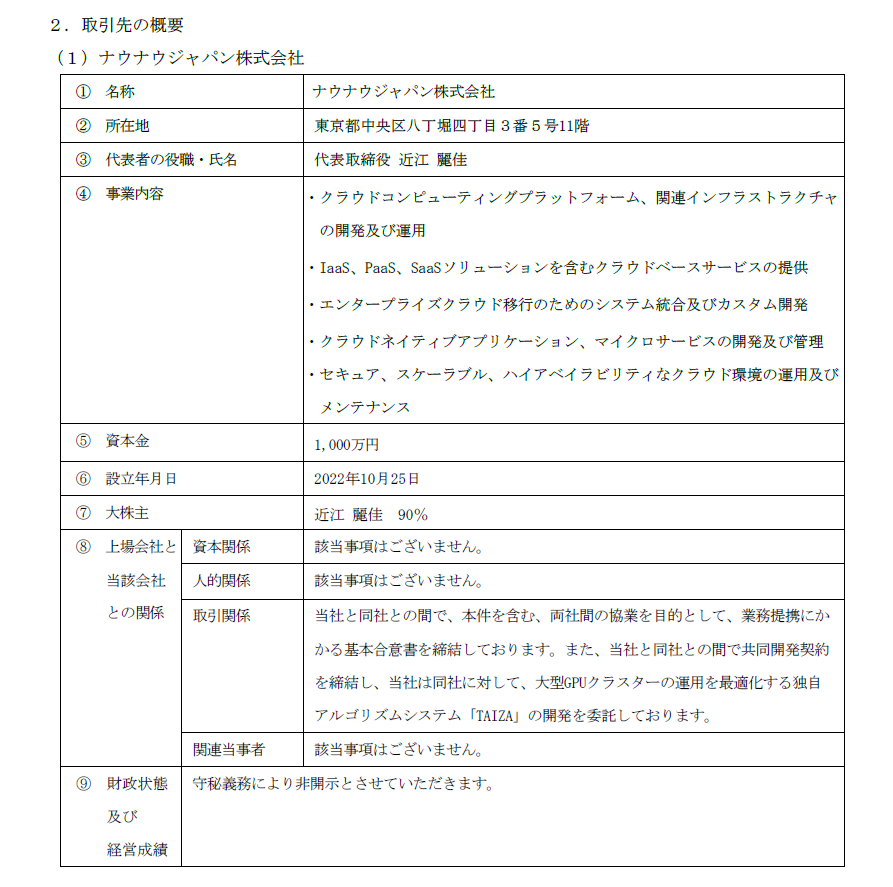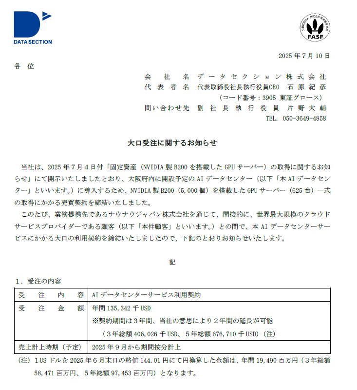 ナウナウジャパンwwなんだそれはw かわいい名前や — かすてら (@cascaskabukabu) July 10, 2025 2025/07/10 データセクション 大口受注に関するお知らせ https://www.datasection.co.jp/ データセクション、ナウナウジャパンとAIデータセンターサービスにかかる大口利用契約を締結、年間194億円、3年総額584億円、5年総額974億円 — ありゃりゃ (@aryarya) July 10, 2025 これ本当に取引実態あるのかな…(ボソッ) — 新垢メタスラ(ベンツマン@株式板) (@Benzman_TAKE2) July 10, 2025 ナウナウジャパンって名前だけでクソ怪しいだろ — yuっちー (@U_U30_60) July 10, 2025 カウカウファイナンスなら知ってる — えっくす (@xcepter) July 10, 2025 調べても名前出てこないような会社が1000億払えるわけないだろ… — 岐阜っ子サリー (@kozukozu331) July 10, 2025 22/10/31 ナウナウジャパン設立(石原紀彦氏の設立したサンインベストメント合同会社と同じ住所) 24/6/28 石原紀彦氏がデータセクションの代表に就任 24/7/19 ナウナウジャパンが現在の住所へと変更 25/07/10 データセクションがナウナウジャパンから194億円×3年の大型受注 — 日村 (@imakebaiikabu) July 10, 2025 ナウナウジャパンよく分からないけどこの手の会社でHP無いってことあるのか? — シリ (@Sirius729) July 10, 2025 時代は会社凸 — あさぎトレード (@asagitrade_) July 10, 2025 デーセク社長の石原紀彦氏の父親は石原邦夫氏。石原邦夫氏は経団連副会長や現東京海上HDの社長も務めたこともある。なかなか重鎮。下手なことしたら親父の顔つぶれちゃう? — クロワッサン (@kid_bitcoin1) July 10, 2025 すごく…怪しいです… — 新垢メタスラ(ベンツマン@株式板) (@Benzman_TAKE2) July 10, 2025 データセクションのNVIDIA製ブラックウェルシリーズB200搭載したGPUサーバーの貸し出し相手って、半導体規制受けてる中国AI企業の抜け道に使われてるわけじゃないよね?データセクション→ナウナウジャパン(株)→顧客 — パンプーチキン (@mickystar0777) July 10, 2025 やっぱり狂ったように上がるやつは一抹の怪しさが必要なんだなと思う。全部真っ白のやつはすぐ織り込まれちゃうから — 山田 (@u2yamada) July 10, 2025 https://kabutan.jp/stock/chart?code=3905 ※ストップ高で上場来高値を更新 新しいハコが爆誕した感じやね — ぷっちょ (@puchogen) July 10, 2025 これはさすがにエーバランスのベトナム案件以来の香ばしさを感じる。 — saku (@sakusaku_kabu) July 10, 2025 ※Abalance(旧リアルコム)、IR広報室長として煽り倒した堀内信之さんが自社株のインサイダー取引の疑いで逮捕されてしまいお詫び(2024/05/16) Abalanceじゃなくて、いつまでもサーバが売れないクオンタムになりそうな気もするな…(´・ω・`) — ざら速(ザラ場速報) @ときどき仮想通貨 (@ZARASOKU) July 10, 2025 ※社名ロンダリング4回のクオンタムソリューションズ「約20億円のNVIDIA製サーバーを販売すると発表しましたが、実は購入者から発注書を貰えていないので取引を中止しました」(2024/09/10) まあ、その、現代の錬金術師だね — Rob (@txjmdagjmwtjm) July 10, 2025 この一抹の怪しさの匙加減が難しいんだよな。行きすぎるとクソ決算とか治験失敗とか粉飾とか巨額ワラントとかの地雷で死んでしまう — 山田 (@u2yamada) July 10, 2025 相手企業名から判断して付き合える人だけ付き合ったら?って注意喚起してくれるところに良心の残り香を感じた — ダヨ🐢X株は6割損切り (@mejironiyouji) July 10, 2025 Source: 市況かぶ全力2階建 投稿ナビゲーション 【速報】石破「疲れた。」 こどおじで手取り30万円だけど生活がきつい