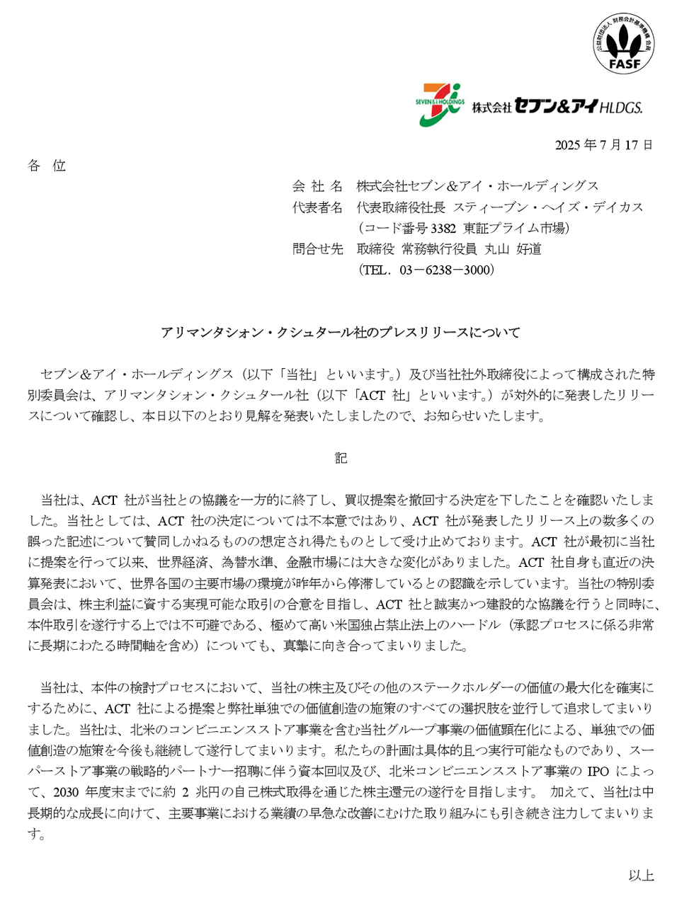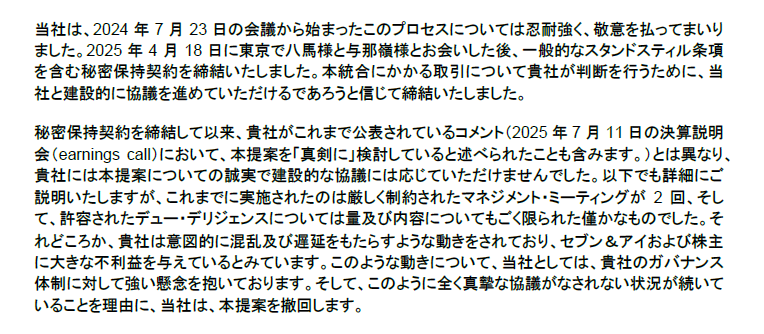 「意図的に混乱及び遅延をもたらすような動きをされており、セブン&アイおよび株主に大きな不利益を与え(中略)ガバナンス体制に対して強い懸念を抱いている。そして、このように全く真摯な協議がなされない状況が続いていることを理由に、当社は、本提案を撤回する」— 鈴木 貴久彦 (@Kikuhiko_Suzuki) July 16, 2025