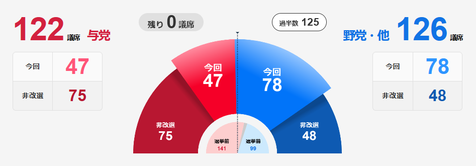 2020年 「ここ数年で一番民主主義の悪い面が出た」2021年 「10年に一度の民主主義の死」2022年 「過去最悪と言われた1976年以来の民主主義の失敗」2023年 「50年ぶりの民主主義の終焉」2024年 「民主主義の質は昨年より悪い」2025年 「出来は最悪で申し分の無い民主主義の終わり」 — 窓際三等兵 (@nekogal21) July 21, 2025 自公候補が続々討ち取られてるのにリベラル陣営がお通夜モードなのが実に新鮮というか、時代の変遷を肌で感じてる。 — jo shigeyuki (@joshigeyuki) July 20, 2025 自民党、過去最低レベルの大敗のはずだが、「思ったよりも負けてない」印象。本当に不思議な選挙だ。 — インディーズ・ロード (@wangan357go) July 20, 2025 https://www.nhk.or.jp/ 自民党、自民党より右の政党に追い詰められるのって地味に結党以来初なのでは? — あるぱか6世 (@nemmumizawa) July 20, 2025 神谷チルドレンが多数輩出w — テゲレッド (@tegered1) July 20, 2025 政治家はさ、選挙期間頑張るじゃなくて、選挙期間以外を頑張れよ。 — 93-26+ (@Market_Letter_) July 17, 2025 こういう選挙結果になると、外国人政策はこれからどうしてもクローズアップされるだろうが、これは数ある右向けのシグナルのひとつでしかない。他にも色々、政策議論の軸が変わってくると思う。 — 米重 克洋 (@kyoneshige) July 20, 2025 選択的夫婦別姓が地を這ってて草。 pic.twitter.com/usIXDwaASV — やぶさめり (@yabusameri) July 20, 2025 自民党も、選挙に外国勢力の介入があった!と喧伝するのはいいんだけど、その前におたくの鈴木宗男を何とかしなよ。外国勢力の手先として一番最初に名前が出るのそいつでしょ…。 — ウハ@ゆっくり政治チャンネル (@yukkuriseijich) July 16, 2025 石破は何回勝敗ラインを割ったら辞めるんだよ。 — あざなわ (@Azanawa_) July 20, 2025 石破のしげちゃんは!辞めへんで! — 富山星餓鬼 (@toyamastarchild) July 20, 2025 まじで菅ジジイは今の状況分かってんの?ただ生きてるだけの顔なんだけど — サキ🙀 (@n_misao330) July 21, 2025 47対78の獲得議席で続投するとか意味不明なんだが — もうり (@mourinista07) July 21, 2025 あれだけ時の総理を無責任に後ろから撃ちまくって辞めさせようとしていたお人が、いざ自分が総理になったら選挙で惨敗しまくって党が崩壊寸前になっても、必死に総理の座にしがみつこうとしてる姿はあまりにも皮肉効きすぎてて醜悪なんだよなぁ… pic.twitter.com/P9OvQQ5qWx — 水月 (@sui72381132) July 20, 2025 自分が間違っていたと決して言わないで言い訳に終始するところなんか、石破は左翼仕草が身に沁みついてるとしか言いようがない。 — ほいみん (@takechan0720) July 20, 2025 なんか為替も先物も「えっ?惨敗したのに石破まだやんの?」って感じで逆に無風なん?w — no one cat🍥 (@noonecat2) July 21, 2025 https://sekai-kabuka.com/ 先物下がらないし為替は元の148円に戻ったし長期金利も下がっているから自民の過半数割れは織り込み済みだったって事? — しのる (@FMAMGXxODnjX5rM) July 21, 2025 https://sekai-kabuka.com/ 参院選通過でアク抜ける? — ロド戦記リターンズ (@TroopsintheDark) July 21, 2025 大敗して誰も責任取らないの、悪しき前例となって「あのとき誰も辞めなかったし今回もいいよね?」みたいに後々悪影響しかもたらさないと思う とりあえず誰かしら腹を切るべき — あるぱか6世 (@nemmumizawa) July 21, 2025 石破茂はすごい。無能すぎて眠っていた若者の政治的関心を取り戻した。今まで誰もできなかった事を成し遂げた。 — えりまど/// (@mad_career) July 20, 2025 「石破、お前だったのか。無能なフリをして自民党を内部から倒してくれたのは。」 石破は、ぐったりと目をつぶったまま、うなづきました。 pic.twitter.com/iu22kjath4 — マンション好きの外資コンサル (@escapejapan2023) July 20, 2025 Source: 市況かぶ全力2階建 投稿ナビゲーション 【悲報】石破さん、本日続投表明と野党との連立拡大を発表w w w w w w w w w w w w w w w w w w w 【画像】女子大学生がルームシェアした結果wwwwwwwwww