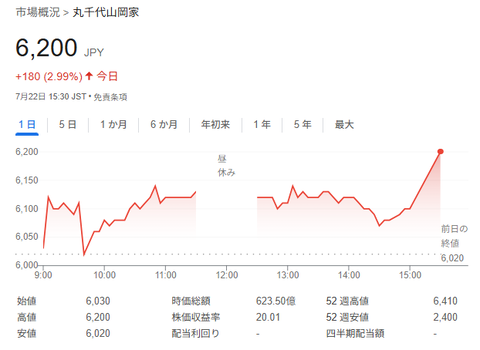 1: 稼げる名無しさん :2025/07/22(火) 20:45:01.55 ID:CgPn7XTB9.net [東京 22日 ロイター] – ラーメン山岡家を展開する丸千代山岡家は22日、8月31日を基準日として9月1日付で1対2の株式分割を実施すると発表した。山岡家は売上高の拡大を背景に株価も上昇基調にあり、22日の株価終値は6200円だった。投資単位当たりの金額を引き下げることで、流動性向上や投資家層の拡大を図る。 株式分割に伴い、株主優待を実質拡充する。保有株数に応じた優待内容を基本的に変更せず、ラーメン無料券の枚数を増やすなどする。 https://news.yahoo.co.jp/articles/f3d6f20fcd6a20ce2b9973b090dfce699b9e0b41 1001: 以下名無しさんに代わりまして管理人がお伝えします 1848/01/24(?)00:00:00 ID:money_soku 報道によりptsで+7%超! ホールドしていた方、おめでとうございますお! 山岡家 【正規販売店】 山岡家 ラーメン 特製味噌(乾麺) 5食入り 山岡家の味がインスタントに! 北海道 札幌 ラーメン 続きを読む Source: 稼げるまとめ速報 投稿ナビゲーション 日本人なのに家紋がない?wwwwwwwww 【速報】閣内からも首相に退陣要求