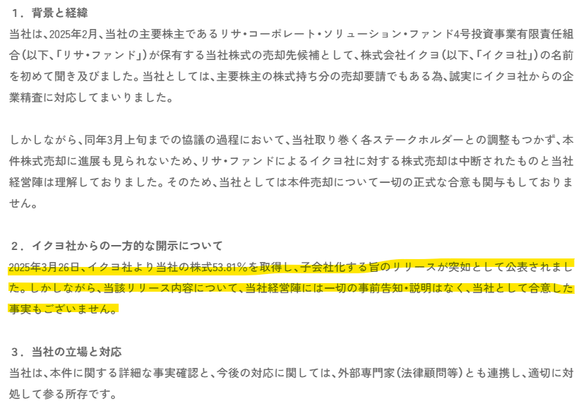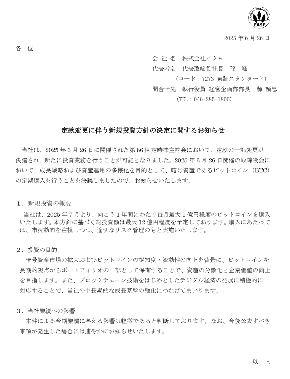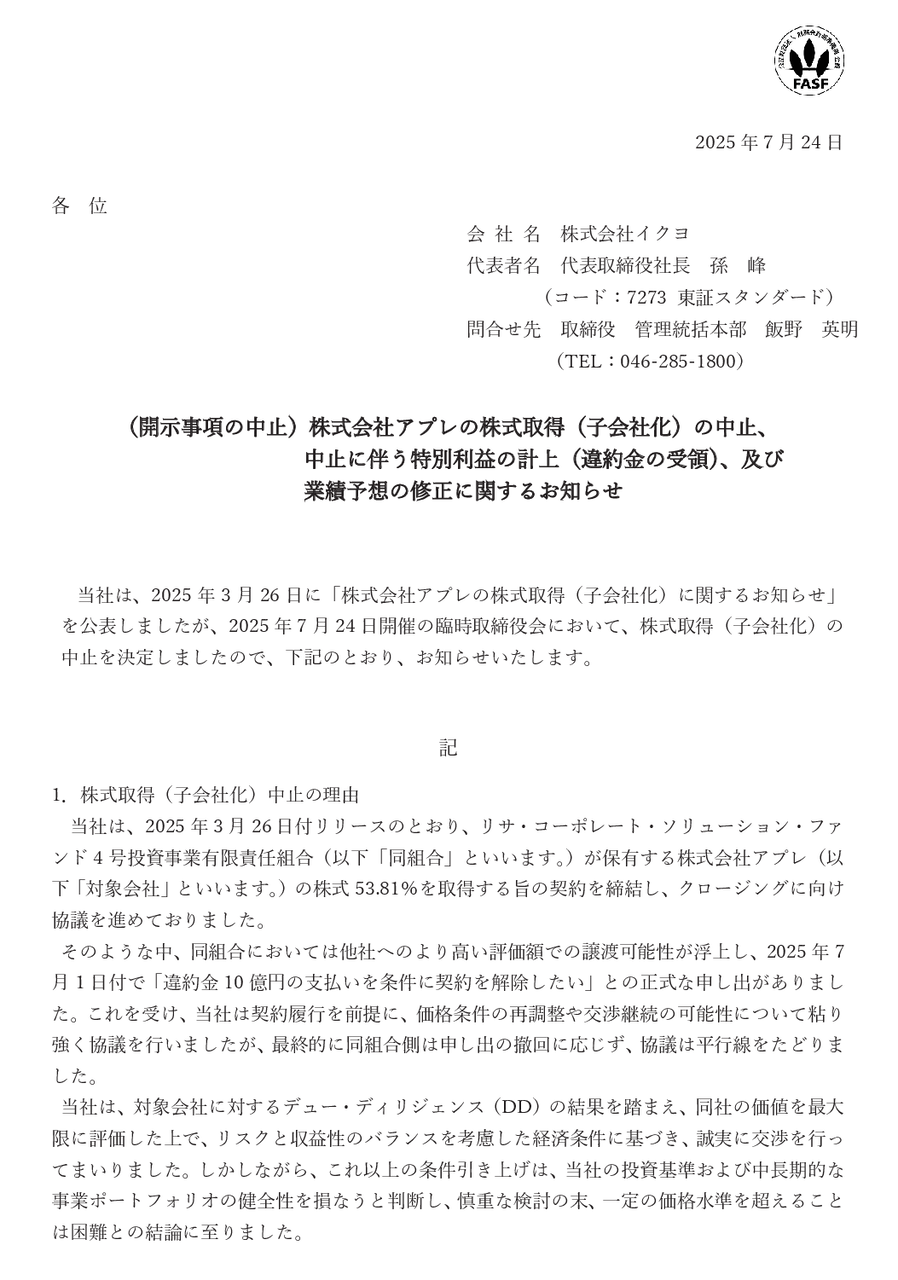 ビットコイン買うだけ事業、大人気やなアレなところに — 居残り佐平次🍥 (@inokori_3814) July 8, 2025 ※主な「ビットコイン始めました」上場企業 ・株券印刷によるビットコイン1点賭けに勝利し瞬間時価総額1兆円を達成したメタプラネット ・電力小売屋のリミックスポイント ・中華系株券印刷業のビート・ホールディングス・リミテッド(旧・新華ファイナンス)・大型上場ゴール企業のgumi・解体の窓口のバリュークリエーション・青汁王子が広告塔(なぜか本人は消極的)のエス・サイエンス(旧・志村化工)・ゲーム屋のenish(エニッシュ)・服屋のマックハウス・自動車部品屋のイクヨ・オンラインクレーンゲームが主力のサイバーステップ・求人広告のイオレ・AIフュージョンキャピタルグループ(旧フューチャーベンチャーキャピタル)・単なる安い服屋で事業再生中のANAP・無料ゲーム屋の東京通信グループ・上場3年で子会社で粉飾決算のアジャイルメディア・ネットワーク ・社名ロンダリング4回のフォーシーズHD ・ネイル屋のコンヴァノ ・社名ロンダリング4回のクオンタムソリューションズ 1番最初にビットコインぜーんぶパクられました!IR出す会社を予想しよう!(´・ω・`) — (しωん)-METAL (@shin3kibou) July 8, 2025 イクヨ 一番危惧してたことが起きてたwwwww — 全力イナゴ少年 (@INAGOBOY) July 24, 2025 ・イクヨのアプレ買収(2025/03/27) https://www.ikuyo194.co.jp/ 『株式譲渡実行日 2025年8月末日』 ・イクヨのトンデモ通期業績予想(2025/05/15) https://www.ikuyo194.co.jp/ ・買収されたアプレ「合意した事実もございません」(2025/05/15) イクヨのこの超絶ガイダンスってアプレっていう貴金属買取販売の会社を子会社化したからなんだけど、アプレ側はこの買収について「当社経営陣には一切の事前告知・説明はなく、当社として合意した事実もございません」だって・・・凄く危険な匂いがする。https://t.co/L3WXOkFeUo pic.twitter.com/VytpvyhcJx — 塩漬けマン@投機ブログ (@shiozukemann) May 15, 2025 ・イクヨ「ビットコイン買うだけ事業をはじめました」(2025/06/26) https://www.ikuyo194.co.jp/『向こう1年間にわたり毎月最大1億円程度のビットコインを購入』『本方針に基づく総投資額は最大12億円程度を予定』 ・イクヨ「アプレ買収は中止になりました」(2025/07/24) https://www.ikuyo194.co.jp/『他社へのより高い評価額での譲渡可能性が浮上し、2025年7月1日付で「違約金10億円の支払いを条件に契約を解除したい」との正式な申し出』『2025年7月25日付で契約を終了』 ・イクヨ、通期業績予想を超絶下方修正 https://www.ikuyo194.co.jp/『アプレを連結の範囲に含めることを前提として連結業績予想を策定しており、主にこれを中止したことによる影響を反映』 逝くよ() — PON (@pon_tosyou) July 24, 2025 え?イクヨくんさぁ 7/1に子会社の契約解除の申し入れあったのに、この発表前にビットコイン配布とかで株価上げてこのタイミングで一気に叩き落としに来たってこと? 遠回しに殺しにきたのではないかね? — えんどうまめ@株垢 (@endoumame2369) July 24, 2025 思い出したけど、増配してたよね増配も消えるんじゃね — とうりゅうもん (@TORYUMON_MAIN) July 24, 2025 しかし、第三者割当増資や中国企業と資本業務提携に始まり連日の業務提携の雨荒らし、アプレ買収負ののれんで超絶決算、10倍増配、ビットコイン購入(毎月1億で最大12億)と出来る限りのIR芸をして株価を吊り上げてアプレ買収中止下方修正とは、糞株の王道を行ってる。REVOLUTIONを彷彿とさせる。 — 塩漬けマン@投機ブログ (@shiozukemann) July 24, 2025 https://kabutan.jp/stock/chart?code=7273 Source: 市況かぶ全力2階建 投稿ナビゲーション 【悲報】覚醒剤14キロを密輸した女さん、不起訴処分へ 時計買うなら何がオススメ?