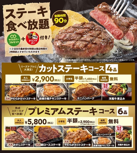 1: 2025/07/29(火) 08:38:34.37 0 ステーキ食べ放題 2025年7月29日(火)<限定メニュー> ※ご注文の最終受付時間は閉店時間の2時間前とさせていただきます。 ※ご注文の制限時間は最初のお料理のご提供から90分です。 ※食べ放題コースはテーブル全員が同じコースのご注文をお願いいたします。 ※過度の食べ残しがある場合は、追加料金を頂く場合がございます。 >>22時から5時までのご注文には、深夜料金として10%加算させていただきます。 ※ステーキは小さくカットしてお召し上がりください。 ※お料理の内容は、季節や地域により変わる場合がございます。 ※ステーキ食べ放題は、内容や日付を変更する場合がございます。 https://www.skylark.co.jp/steak_gusto/menu/steak_tabehodai/index.html 続きを読む Source: 投資ちゃんねる – 株・FX・仮想通貨・投資2chまとめ 投稿ナビゲーション 参政党の支持率が野党1位に 日経新聞・テレ東世論調査 【悲報】「娘をかばいきれんかった」…ベトナム技能実習生に襲われた母、全身血まみれで近所へ助け求め