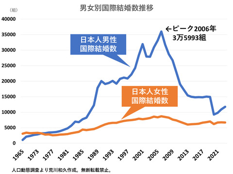1: 2025/07/28(月) 09:46:22.71 Yahoo!オリジナル記事 https://news.yahoo.co.jp/expert/articles/646c4ccf14f3917c075505ea73924475b45f1412 荒川和久 独身研究家 7/28(月) 9:05 「国際結婚が増えている」などというネット記事をたまに見かける。しかも「日本人の女性が外国人の夫と結婚する数が増えている」というものだ。 こう聞くと、ただでさえ未婚の男余り現象があるにもかかわらず、日本人女性と外国人男性との国際結婚が増えてしまうとますます日本人男性の男余りに拍車がかかってしまうと思われるかもしれない。 参照→未婚男性の「男余り430万人」の実態~もはや若者ではなくおじさん余りへ ここでいう国際結婚とは、夫婦のどちらか一方が日本人である婚姻を指すが、確かにコロナ禍の始まりだった2020年1万5452組に対して、2023年は1万8475組と約20%増であるが、とはいってもそれは2020年が特殊だったからであり、決して全体的に増えているという話ではない。 では、日本人の女性の国際結婚だけが増加しているかと言えばそれもまた違う。 日本人男女の国際結婚数 日本における国際結婚の推移を長期的に確認しておこう。 男女別の婚姻数推移をグラフ化したものが手かである。 ご覧の通り、全体的に傾向から言えば、男女とも国際結婚のピークは、1990年代から2000年代にかけてであり、2006年の男女計4万4701組(うち男3万5993組)を頂点として、その後は急激に減少している。ピークからすれば、むしろ60%近くも激減した。 全体的には、男性の国際結婚だけが激増→激減という変動幅が大きいのに対し、女性はその変動幅はなだらかである。男性の婚姻数が大幅に減少した2020年でも女性の場合はさほど減っていない。 要するに、男性の国際婚姻数が激減したことで、国際結婚の男女比が最近は拮抗してきたに過ぎず、決論から言えば、男女とも国際結婚が増えているということではないようだ。 この男性の国際結婚数の激増と激減はある指標と密接に関係する。 それはドル円為替レートである。 1980年からの為替レートの推移と国際結婚数の推移を見ると、円高になれば国際結婚が増え、円安になれば減るという強い相関がある。 90年代からゼロ年代は1ドル100円前後の円高であり、それはつまり、同じ円の金額でも当時は海外ではより価値が高かったということである。だから、当時は海外旅行が盛んで、日本人による海外での爆買い現象などもあった。 同時にそれは、海外からすれば日本は魅力的な出稼ぎ市場でもあり、その中にはアジア諸国から流入する女性の働き口としてパブなどの店舗が増えた時期でもある。 2000年代に増えた日本人男性の国際結婚の出会いきっかけがすべてそうした店でのものとは限らないが、日本人男性に外国人女性を紹介する国際結婚斡旋所などもあり、少なくとも円高の影響によって、ある意味「国際結婚市場」が成立したことは確かである。 わかりやすく言えば、為替レートのおかげで当時の日本人は、アジア諸国の国に比べれば高給取りに見えたのである。 結婚とは、今も昔もつくづくお金によって決まるものなのだ。 とはいえ、こうした背景には悲しい結末もある。以下は実話である。 1990年頃フィリピンパブで働く女性と知り合った日本人男性(53歳)が、2005年にその女性と結婚した。女性は再婚だったが、彼は初婚だった。まさに日本人男性がもっとも外国人女性と結婚したあたりの年である。 二人の間には子どもも出来きたが、妻はフィリピンに帰国。夫の男性は日本で仕事を続ける関係で、年に何度かフィリピンを訪れることでの妻と子どもとの関係を継続していた。彼は、行くたびに100万円程度の現金を妻に渡すが、当時フィリピン人の平均年収が50万円の時代であり、普通に暮らせば2年間は生活できる金額である。 但し、この男性は決してお金持ちだったわけでもない。警備会社で働くごく平均的な収入のサラリーマンで、日本での生活を節制して妻と子のために資金を作っていた。 彼は60歳で定年退職すると、退職金などまとまったお金を手に2013年にフィリピンに移住した。これでやっと妻と子と家族一緒に暮らせると喜んでいたことだろう。 ところが、その渡航からわずか3か月後、フィリピンの路上で、彼は無残に殺害されることになる。後ろから銃で射殺されたのである。 ※以下引用先で 続きを読む Source: 投資ちゃんねる – 株・FX・仮想通貨・投資2chまとめ 投稿ナビゲーション 石破首相、戦後80年のメッセージ発出「適切に判断」 【相場】ドル買いでドル円は1ドル148円台半ばに円安進行も、欧州圏は想定外の欧米合意弱気意見でユーロ売り 1ユーロ172円台前半で下げ止まり点を確認中 日経平均は本日も続落