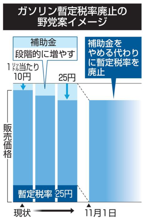 1: 2025/07/30(水) 21:36:36.56 ● BE:567637504-PLT(51005) sssp://img.5ch.net/ico/si2.gif 与野党はガソリン税の暫定税率廃止法案に関し、秋の臨時国会での成立を目指す。 補助金を拡大しつつ、11月に暫定税率を廃止する野党案をベースに議論する見通しだが、実現には課題が残る。 政府、与党が重視する代替財源が明確になっていない上、ガソリンスタンドなど流通現場に負担が生じるかどうかも論点になりそうだ。 野党案は立憲民主や日本維新の会、国民民主など8党の政調会長らが29日に協議してまとめた。 現在、ガソリン価格を抑えるため1リットル当たり10円を支給している補助金を11月に向けて段階的に増やし、暫定税率と同じ水準の約25円にする。 その後、暫定税率を廃止する仕組みだ。 廃止による急激な価格変動を抑えることで、ドライバーの買い控えを回避する。 スタンドにとっては、高価格帯の際に仕入れたガソリンを安く売ると損失が出るケースがあるが、野党はこの仕組みで懸念を解消できると強調した。 一方、財源確保策は明らかになっていない。ガソリン税の暫定税率廃止により、国と地方を合わせて年1兆円規模が減収となる。 https://news.yahoo.co.jp/articles/a1a1175b7f13dae08201b59edec816941b52c6d2 続きを読む Source: 投資ちゃんねる – 株・FX・仮想通貨・投資2chまとめ 投稿ナビゲーション 【暇】第二新卒ワイ、社内ニート化してしまう 【速報】田久保市長、市長辞職を撤回