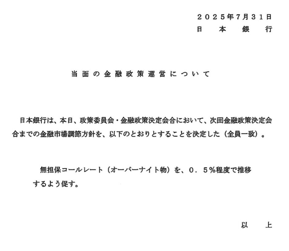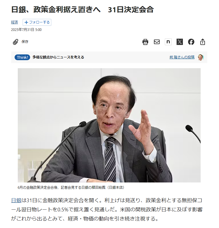 日銀金利据え置きの0.5%。みんな知ってたリーク通り。 — 第五な人 (@DaigoH555) July 31, 2025 https://www.nikkei.com/ ↓https://www.boj.or.jp/ 現状維持ではなくて、景気不透明で怖いので、物価対策先送りって書いておこうな。途中の数字は結論から逆算してるけど責任者取る必要ないから心配するなと。 — ヴァン (@vancouveryZZ) July 31, 2025 2025年の物価予想を7月で0.5%も上方修正するとか、物価の安定に失敗してるやろ。 — ぷろっぷ (@PropTrader88) July 31, 2025 総裁の心拍数が149になりました pic.twitter.com/qIioFYq0px — ちゃわんご@投資の沼 (@chawan_wabita) July 31, 2025 https://www.youtube.com/ 植田総裁の会見は各記者が「いつ利上げするのか」 あの手この手で聞き出そうとするも 鉄壁のハト発言でのらりくらりやり過ごす構図 植田さんが総裁に就任以来ずっと同じやり取りを見せられてる気がするw — ポンチョ (@pponchooo) July 31, 2025 まだハトってんの植田、なんなのあいつ — 2代目琵琶丸 (@2eTzXR96gXdOdGV) July 31, 2025 植田日銀総裁の主な発言「不確実性はなお高い」「食料品価格の上昇については低下すると予想」「基調的物価の現状はまだ関税の影響を受けて、ゆっくり上昇が続いていると考えいる」「今後関税の影響を受け製造業など収益は下方に、賃金への影響が懸念される」「賃金のサービス価格への影響、加速しているとはみていない」「基調的な物価上昇率は2%に届いておらず、緩和的な金融政策を維持している」「足元は供給先による物価高であり、利上げで景気を冷やし食料品価格が下がるということになる」「年後半にいくにつれ、実質賃金は良い動きが出てくると見ている」 不確実性が高いといって放置するには、金融政策が十分に緩和的すぎる — TT (@theme_trade) July 31, 2025 総裁が意味わかんない回答してるから円安が捗る捗る。これはインフレおかわり待ったなし。民草の生活苦を一番分かって無いのは自民党ではなく総裁でした。(´・ω・`)つら — 僻地課長 (@bubu0404) July 31, 2025 https://sekai-kabuka.com/※2025年4月2日以来、約4か月ぶりの150円台 植田総裁が明確にタカ派的スタンス示さないと円は売られてしまいますね — YENZO (@YENZOU) July 31, 2025 政局不安の円売りはあったけどドル売りだったり利上げ示唆期待で踏みとどまってたけど、FRBはタカ派で、日銀がハト派となると、そりゃドル円は150円抜けますよ — 夜の日陰 (@hizashi_kun) July 31, 2025 なんでドル円150円突破してるのに暴動起きてないんですか? 皆さん紳士なんですか? — chanco (@chanco09751990) July 31, 2025 ドル円150円行ったのに日経先物の動きは冴えないねもしかして悪い円安と受け止められてます…? — 投資家ヨーダ (@10xxx100xxxx) July 31, 2025 海外投資家の買いが多いのは、まぁ予想できたけど個人の現物売りの多さはビックリだわ — さるたろ (@super_sarutaro) July 31, 2025 関税合意で42000の週 個人 1兆2000億円売り海外 1兆2000億円買い これまた両極端な — 確認用 (@news9111) July 31, 2025 海外ニキめっちゃ買い越してるやん — IJO (@raiku132) July 31, 2025 個人売りまくりワロタ — マーケットデストロイヤー岸田 (@fffffgagaga) July 31, 2025 Source: 市況かぶ全力2階建 投稿ナビゲーション 昭和の遺物と言われたFAX、堅牢なセキュリティを評価され米国で成長していた! 【画像】角上魚類とか言う魚特化のスーパーについて