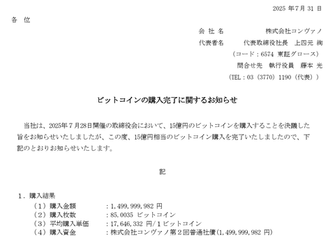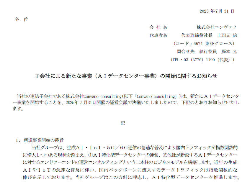ビットコイン買います宣言すれば株価ブチ上がって個人が群がる東証ってすげえなあ — あろれの抜け殻 (@alorest_b) June 16, 2025 ※主な「ビットコイン始めました」上場企業 ・株券印刷によるビットコイン1点賭けに勝利し瞬間時価総額1兆円を達成したメタプラネット ・電力小売屋のリミックスポイント ・中華系株券印刷業のビート・ホールディングス・リミテッド(旧・新華ファイナンス)・大型上場ゴール企業のgumi・解体の窓口のバリュークリエーション・青汁王子が広告塔(なぜか本人は消極的)のエス・サイエンス(旧・志村化工)・ゲーム屋のenish(エニッシュ)・服屋のマックハウス・自動車部品屋のイクヨ・オンラインクレーンゲームが主力のサイバーステップ・求人広告のイオレ・AIフュージョンキャピタルグループ(旧フューチャーベンチャーキャピタル)・単なる安い服屋で事業再生中のANAP・無料ゲーム屋の東京通信グループ・上場3年で子会社で粉飾決算のアジャイルメディア・ネットワーク ・社名ロンダリング4回のフォーシーズHD ・ネイル屋のコンヴァノ ・社名ロンダリング4回のクオンタムソリューションズ ネイル屋がビットコイン買う意味 — 御発注(コジん投資家、御発注塾塾長) (@erroneousOrder) July 17, 2025 2025/07/31 コンヴァノ ビットコインの購入完了に関するお知らせ https://www.convano.com/ ネイルとビットコインなんも関係なさそうだけど、ネイリストとか仮想通貨好きそう — 変なメガネのまいる (@flagcrashers) July 17, 2025 ネイル屋がデータセンターなんて、コンヴァノのあり? — 猥さん,CCC↪️ (@0126301d) July 31, 2025 2025/07/31 コンヴァノ 子会社による新たな事業(AIデータセンター事業)の開始に関するお知らせ https://www.convano.com/「AIデータセンター事業は高単価・高マージンが期待される一方、事業規模・資本投下額ともに大きいため、現段階では業績に与える定量的影響を確定し得ず」 エステティック東証ビットコインセンター — うしっクマ♨ (@bullbear48) July 31, 2025 コンヴァノ手当たり次第やって株価上げる事が完全なる目的になってるw — もっち (@motti1234) July 31, 2025 https://kabutan.jp/stock/chart?code=6574 ※ストップ高で大引け コンヴァノ、四季報見たらスピード感に強みってあって笑ってしまった。 — れいんぼ (@ramune75) July 31, 2025 ネイルサロンが気軽に小資金で参入できるような事業に先行者や技術的な優位性とかあるんかねぇ? — 新垢メタスラ(ベンツマン@株式板) (@Benzman_TAKE2) July 31, 2025 AIデータセンターって太陽光発電並に簡単にやれるの? — けつあな確定申告 (@peepoo_stock) July 31, 2025 無理よ — 〈テキト~資家〉haruyama_ (@zeni_gebafuruoh) July 31, 2025 資本金100万のとこがAIDCなんて出来っこねーよwww 株主バカにすんなよww — メコン川幸子 (@madoumeko) July 31, 2025 データセンターが一気に胡散臭くw — 株ゲー (@jpx_hiroi) July 31, 2025 ビットコインネタが擦られすぎてあんまり株価が上がらなくなったのでボロ株連中がAIデータセンターネタに走り始めた。買い物がBTCからGPUに変わっただけで本質は同じ — スペさん (@kumakuma7) July 31, 2025 ずっと昔、あらゆる糞企業が太陽光発電に群がった時のように、今はAIデータセンターとビットコインに群がってる感 — 塩漬けマン@投機ブログ (@shiozukemann) July 31, 2025 コンヴァノこんなに調子良いのになんで本業じゃなくクズ株の仲間入りしたがるんでしょうねw — miseitadameyo (@xtestarossa) July 31, 2025 2025/07/31 コンヴァノ 業績予想の上方修正に関するお知らせ https://www.convano.com/ ネイル屋、またなんか出してるw — 暗屯子アルファ (@Antonko_ALPHA) July 31, 2025 2025/07/31 コンヴァノLG Chem Ltd.とのPMDA(医薬品医療機器総合機構)承認取得に向けた業務提携契約締結に関するお知らせ https://www.convano.com/「本件がもたらす2026年3月期通期業績への影響につきましては、(中略)全体で売上収益7,160百万円(前回予想比+160百万円)、営業利益1,520百万円(同+520百万円)へと修正しております。医療用ヒアルロン酸(HA)製剤の上市時期は2026年2月を予定しており、上市による影響を売上収益に30百万円織り込んでおります」 事業目的、もはや「株価が上がる流行の事業」でええやろ… — 空き缶 (@akikankeri) July 31, 2025 ネイルサロンだけに小手先を綺麗に飾るのが上手いどすなあ — もちベーコン (@qxqxqxaquas) July 31, 2025 ネイル屋だけに詰めが甘い気しか — 損切り全損@退場 (@tanehan) July 31, 2025 Source: 市況かぶ全力2階建 投稿ナビゲーション 【速報】麻生太郎氏 「やめさせるのは簡単ではない」 【相場】植田総裁会見にて利上げはまだ遠い予想 1ドル149円台前半に戻す