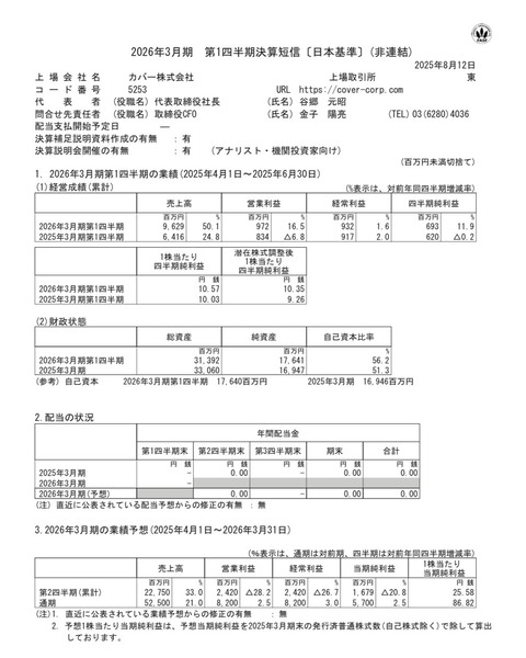 ホロライブ成長が止まったぽいな pic.twitter.com/xHFlWIInBB — ぷっちょ (@puchogen) August 12, 2025 https://cover-corp.com/ カバーの決算説明資料、登録者100万人越えライバー数のスライド、エニカラとの比較のスライド、総視聴時間のスライド・・・全部なくなってんね。登録者数自慢がなくなって全体的におとなしくなってる。業績イマイチだからかな。 — ケミ介 (@chemisuke_sikyo) August 12, 2025 あのへんの会社は特定のタレントに対する依存度というか占有率を開示した方が良いんではないか(上位10人とかでも良いので — 銀髪推進派 (@alpaka) December 2, 2024 売れてる人は普通に数億円の稼ぎの世界なんだろうな。ちゃんと芸能界だ — かなた (@tn4mdg1) May 13, 2025 演者なんて配信してなんぼやと思ふがカードで食っていくとかなんかホロライブも最後はブシロード化しそうやの pic.twitter.com/uvavHwTUYf — ぷっちょ (@puchogen) August 12, 2025 演者に負担かけないIPビジネスだ(サイン付きカード排出率も激低らしい) — もちベーコン (@qxqxqxaquas) August 12, 2025 増やさなあかんのは演者であって従業員ではねぇだろ pic.twitter.com/bIYkjScvI5 — ぷっちょ (@puchogen) August 12, 2025 ※2026年3月期 第1四半期決算説明資料「従業員数738人」(前年同期比+168人) カバーは養う社員ばかり増えてと指摘されるのは理解できるんだけど、コンテンツ制作にあたってエンジニアがまったく足りていないという話も同時に聞くので、体制作りが進んでいるとするならプラス面もあるんじゃなかろうか それはそれとして買いたくなる数字ではないが — 確認用 (@news9111) August 12, 2025 Vtuber事務所のタレント1人当たりの売上みたいに、タレントに対する社員数や社員当たりの売上の指標出してきそう、厄介株主が株主提案で — もちベーコン (@qxqxqxaquas) August 12, 2025 2倍近く演者がいるにじさんじを支える社員がブラック環境なのかな — anne (@stupiddialog) August 12, 2025 カバーのVtuberのデビューないのに社員数は増え続けてる上に、辞めた社員が個人Vtuberデビューしてるのウケる — もちベーコン (@qxqxqxaquas) August 12, 2025 https://www.youtube.com/ 友人Aも転生してて草 — 「ざ」 (@zaramebekko) July 5, 2025 ん?友人Aって人が転生?スタッフだったから転生では無くVtuberデビューでは? — カズ (@kazushige199091) June 27, 2025 https://kabutan.jp/stock/chart?code=5253 Source: 市況かぶ全力2階建 投稿ナビゲーション 【速報】ブラック企業の基準、サビ残があるかないかに決定する 選挙前の政治家「氷河期世代を支援します!」→氷河期「はいはい、また口だけでしょ(冷めた目)」